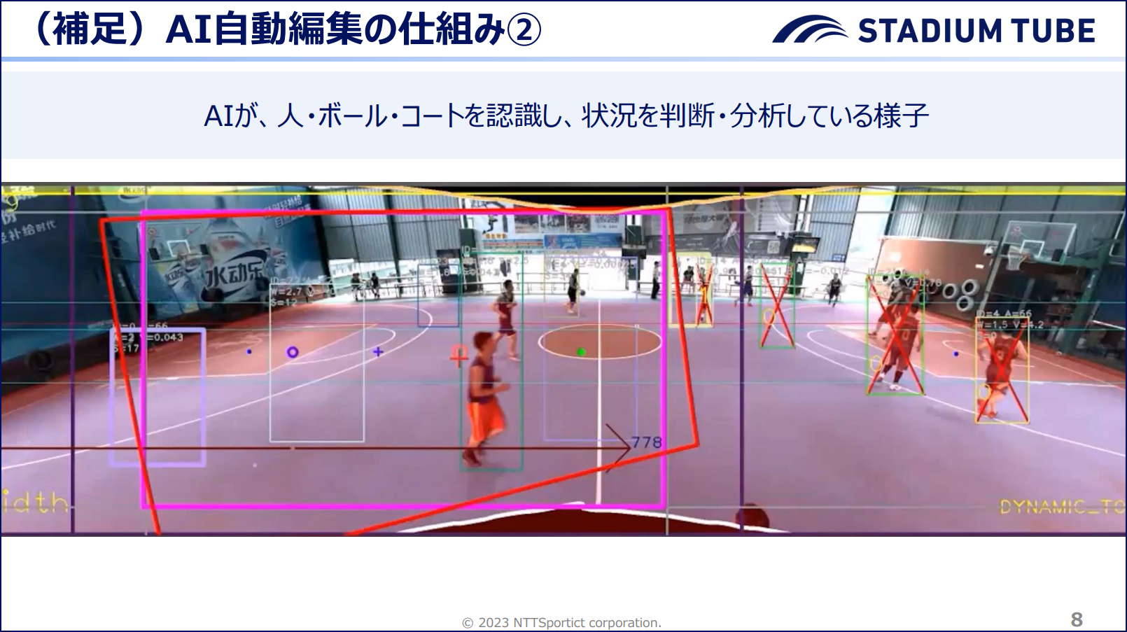AIカメラにはレンズが2つまたは4つ付いており、それぞれのレンズで撮影した映像をつなぎ合わせて、大きなパノラマ映像を作っています。そのパノラマ映像内を拡大したりスライドしながら動くことで、テレビカメラで追いかけるような映像を生成している、というのが簡単な仕組みです。全体を俯瞰するパノラマ映像が生成されているため、映像の撮り逃しがなく、シーンの振り返りができます。