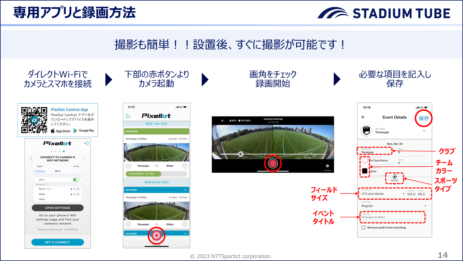 撮影・録画の操作方法も簡単で、スマホに専用アプリをインストールして契約アカウントでログインし、ダイレクトWi-Fiでカメラとスマホを接続。後は画角をチェックし、ボタン一つで撮影が開始できます。