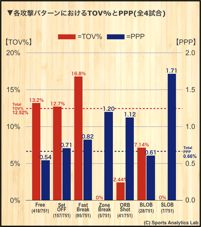 ここでは、各攻撃パターンのTOVとPPPを比較して、ファストブレイクの有効性を見ていきます。TOV%は(その攻撃パターンで発生したTO)÷(その攻撃パターンの試行回数)、PPPは(Point Per