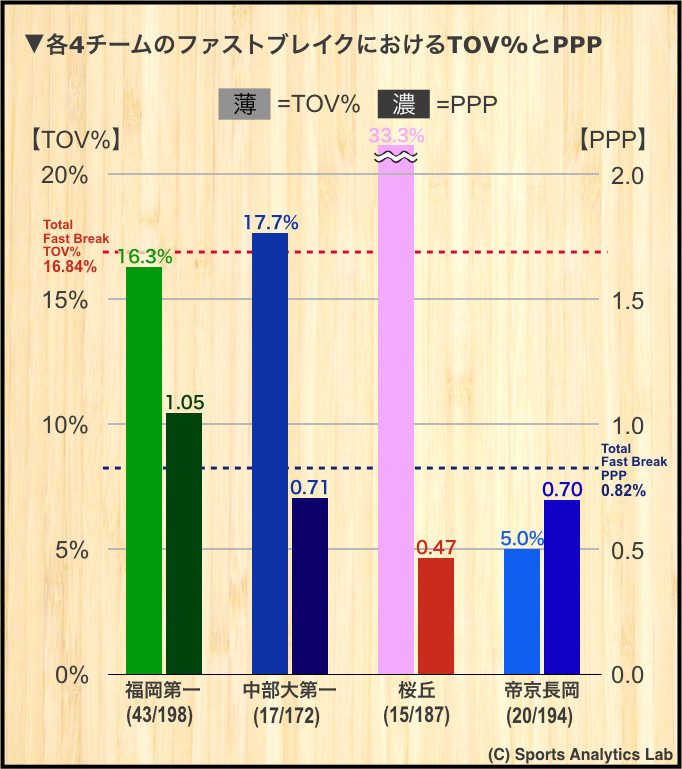 福岡第一でもTOV%が15%を超えています。ただ、PPPは唯一1点を超え、なおかつ他チームの倍以上施行しています。留学生のスティーブ選手が味方以上に走るシーンも少なくない福岡第一です。このTOV%でも他チームにPPPで差をつけているのは納得かと思います。