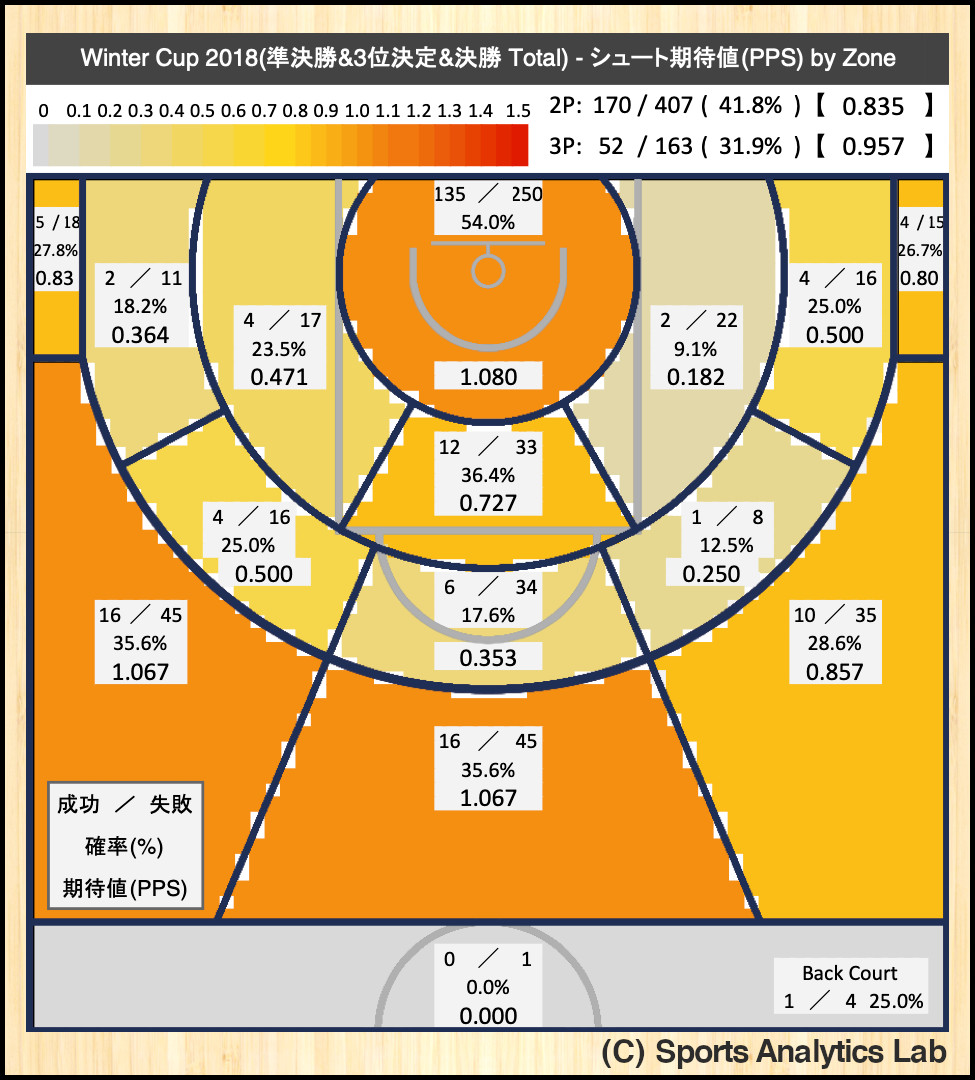 全4試合を合計したエリアごとのシュート期待値をコート上に色で示しました。シュート期待値(PPS:Points Per