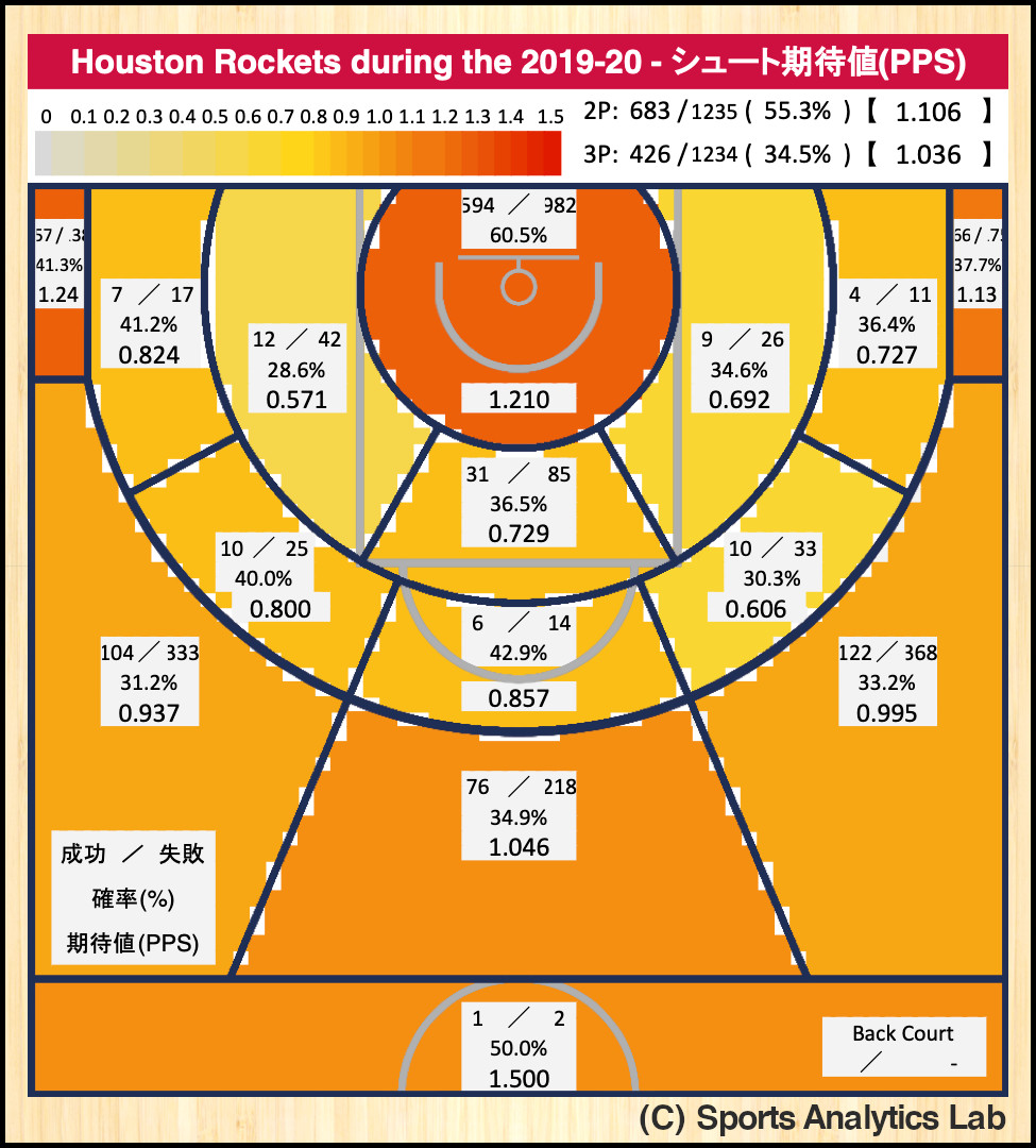 こちらが最初に例にも挙げたNBAのヒューストン・ロケッツの2019-20シーズンのエリア別シュート期待値です。(~2019年12月17日SAS戦)