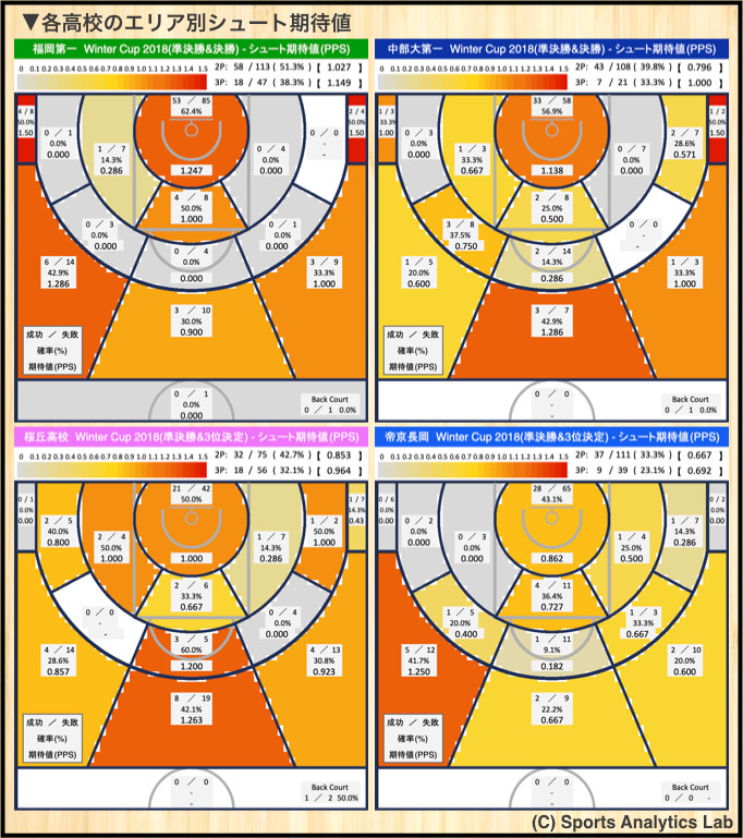 第71回全国高等学校バスケットボール選手権大会」の準決勝2試合と決勝戦、3位決定戦の計4試合を対象とします。またこの検証は公開されているボックススコアで行うことが難しいため、この4試合をSPLYZA