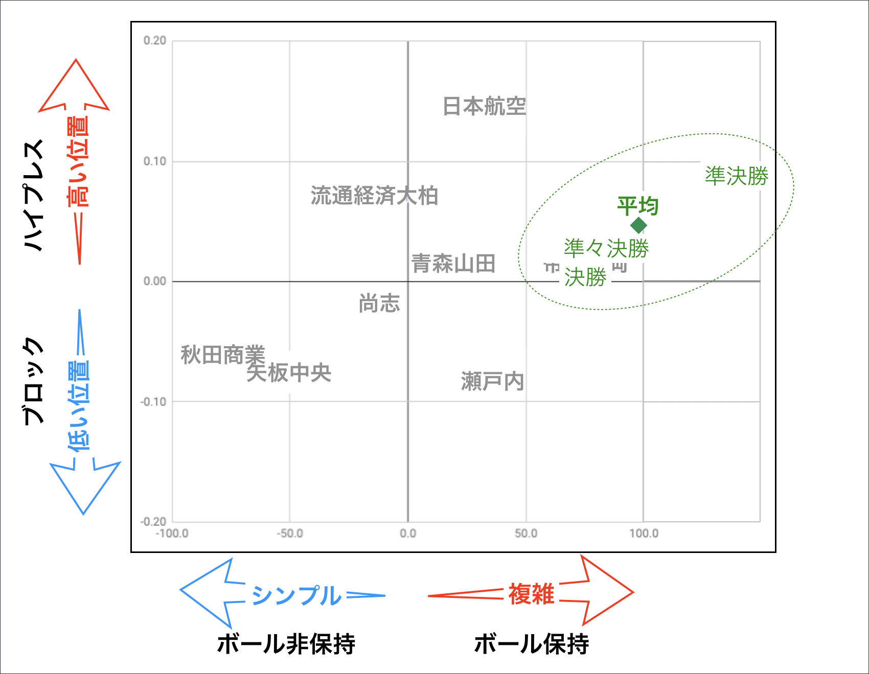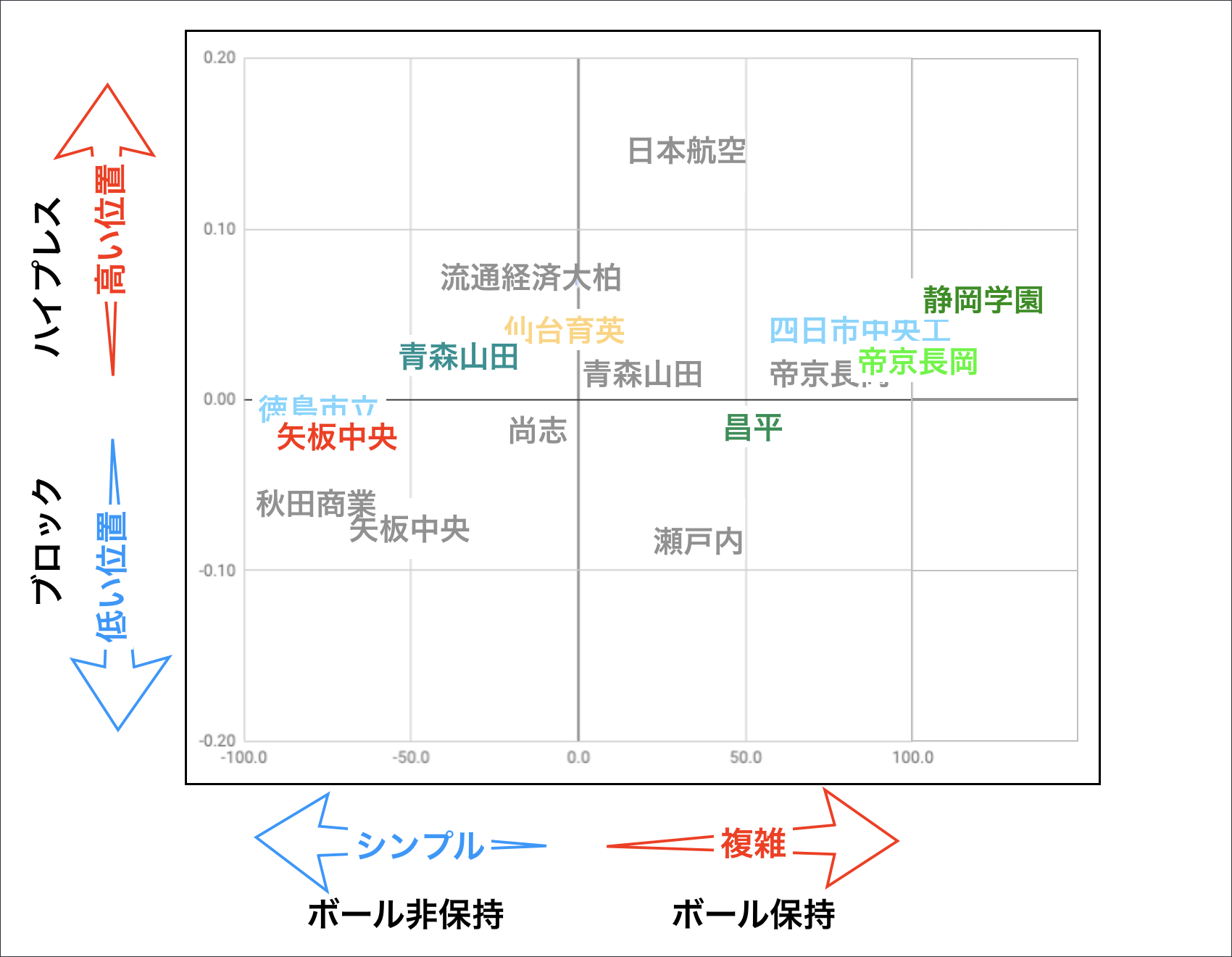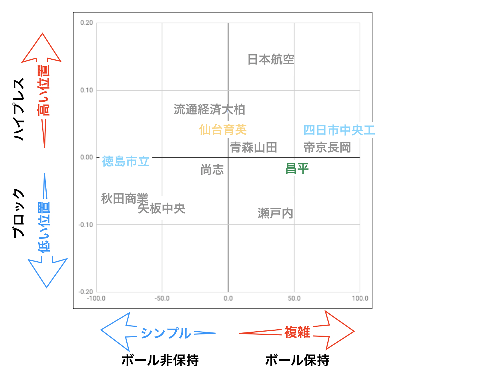 スタイルマップからは、四日市中央工は「ボール保持」「ハイプレス」、昌平は「ボール保持」「ブロック」、仙台育英は「ボール非保持」「ハイプレス」、徳島市立「ボール非保持」「ブロック」として分類できました。