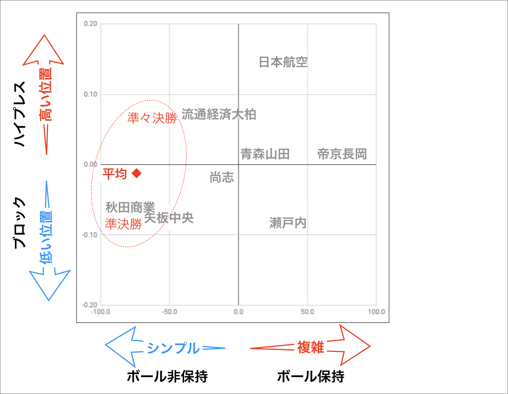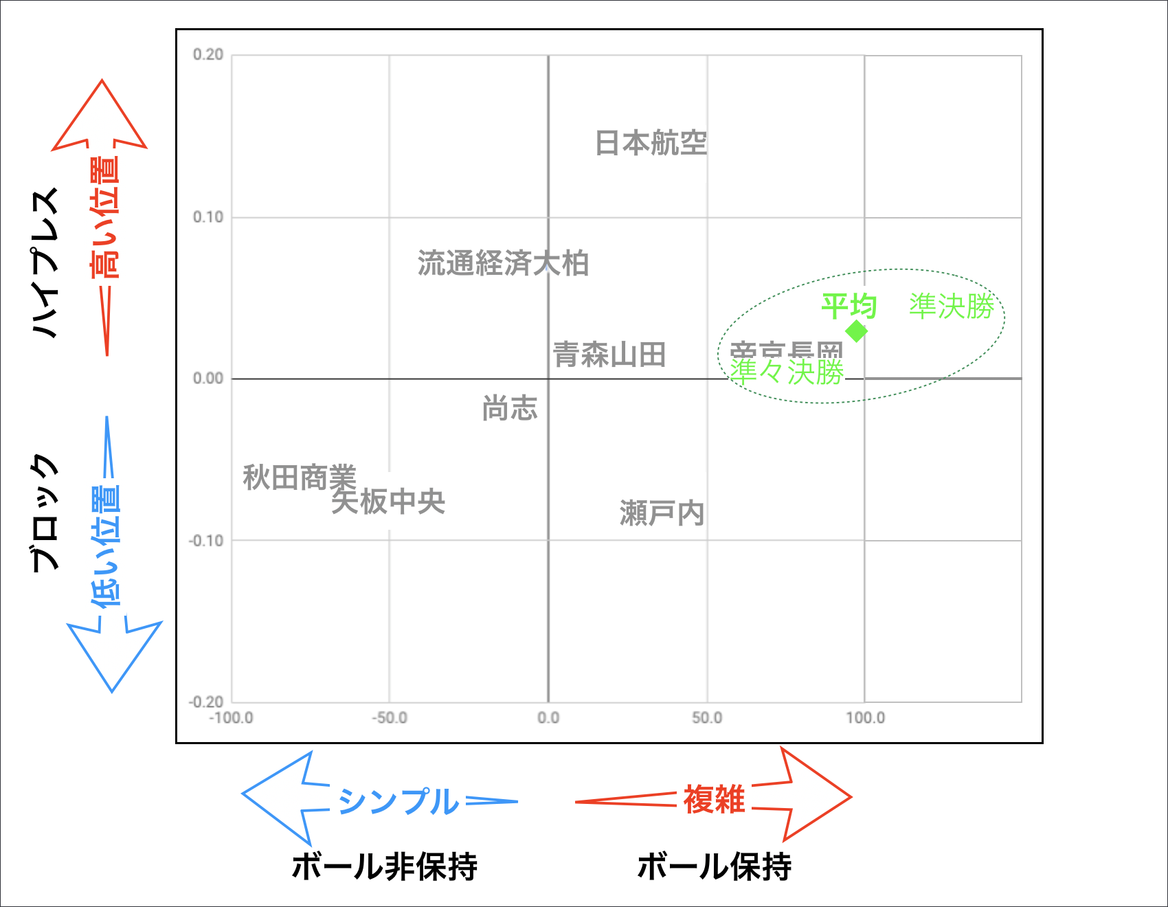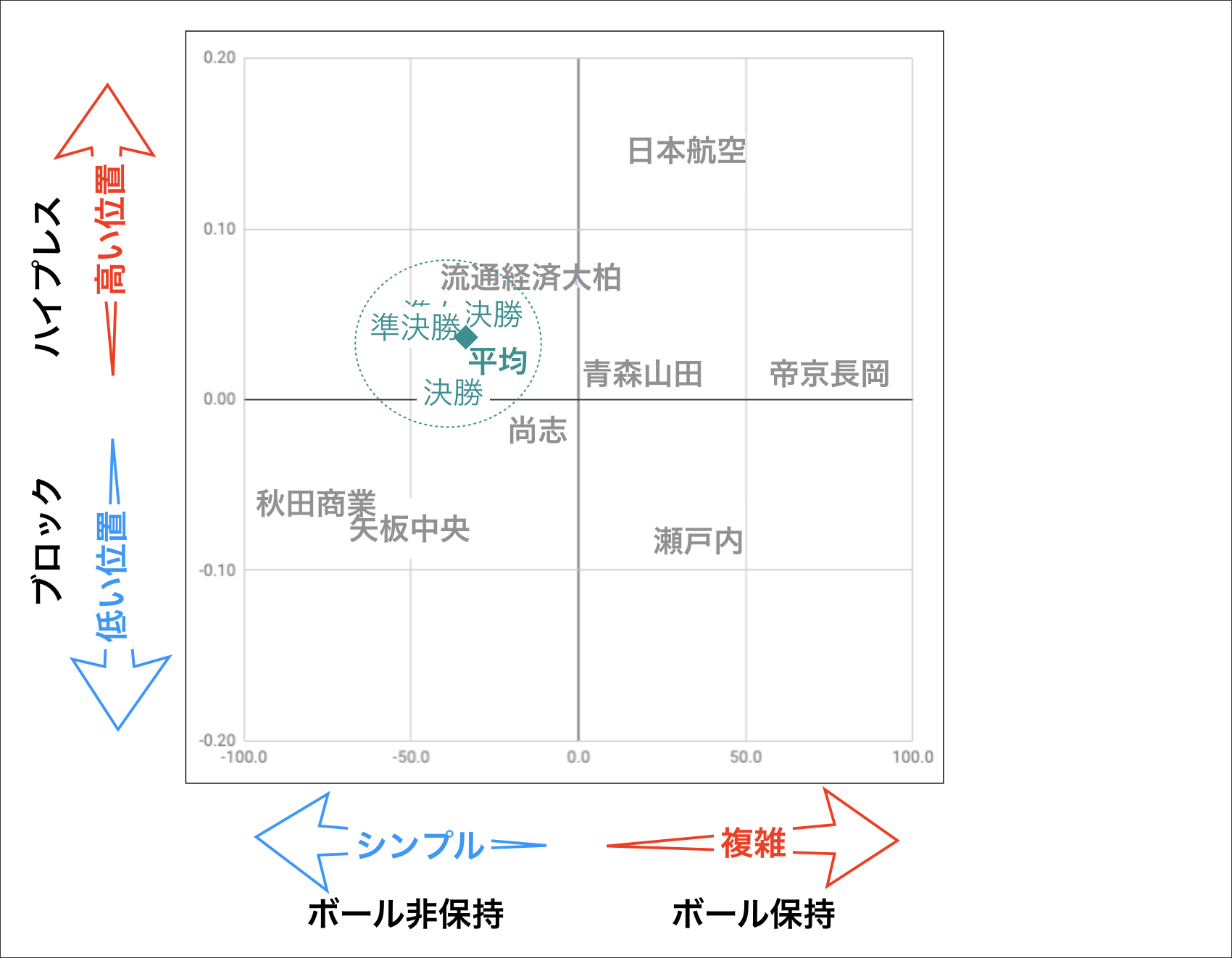 スタイルマップからは、四日市中央工は「ボール保持」「ハイプレス」、昌平は「ボール保持」「ブロック」、仙台育英は「ボール非保持」「ハイプレス」、徳島市立「ボール非保持」「ブロック」として分類できました。