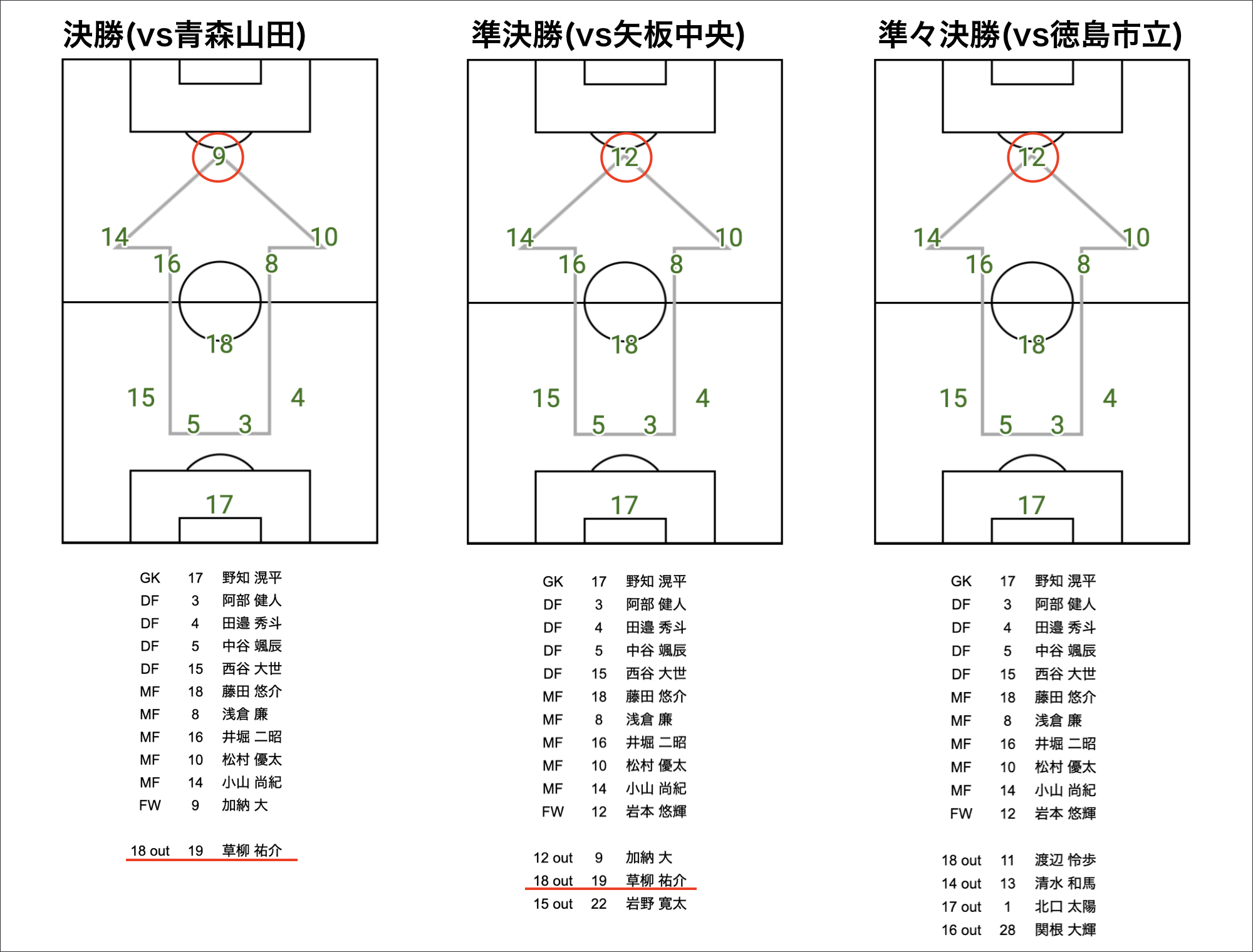 準々決勝から3試合を通じて、システムは4-5-1でスタートし、スターティングメンバーはほぼ固定されていましたが、決勝ではそれまで先発していた12番の岩本選手ではなく、9番の加納選手がFWとして先発しました。