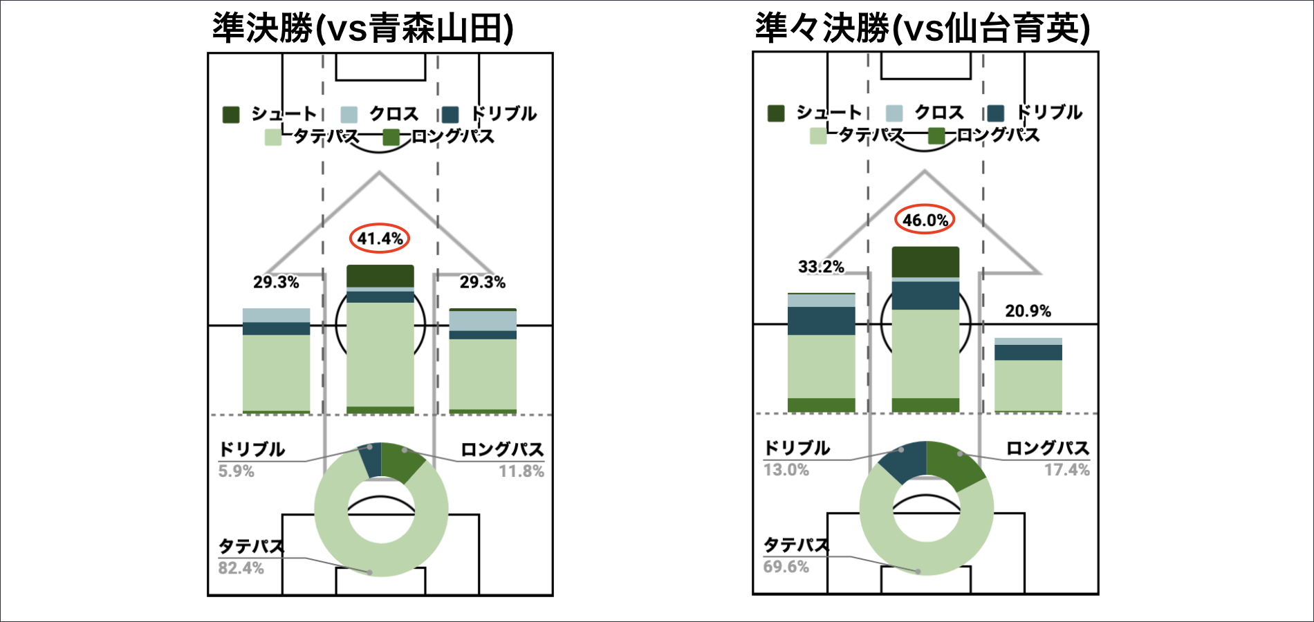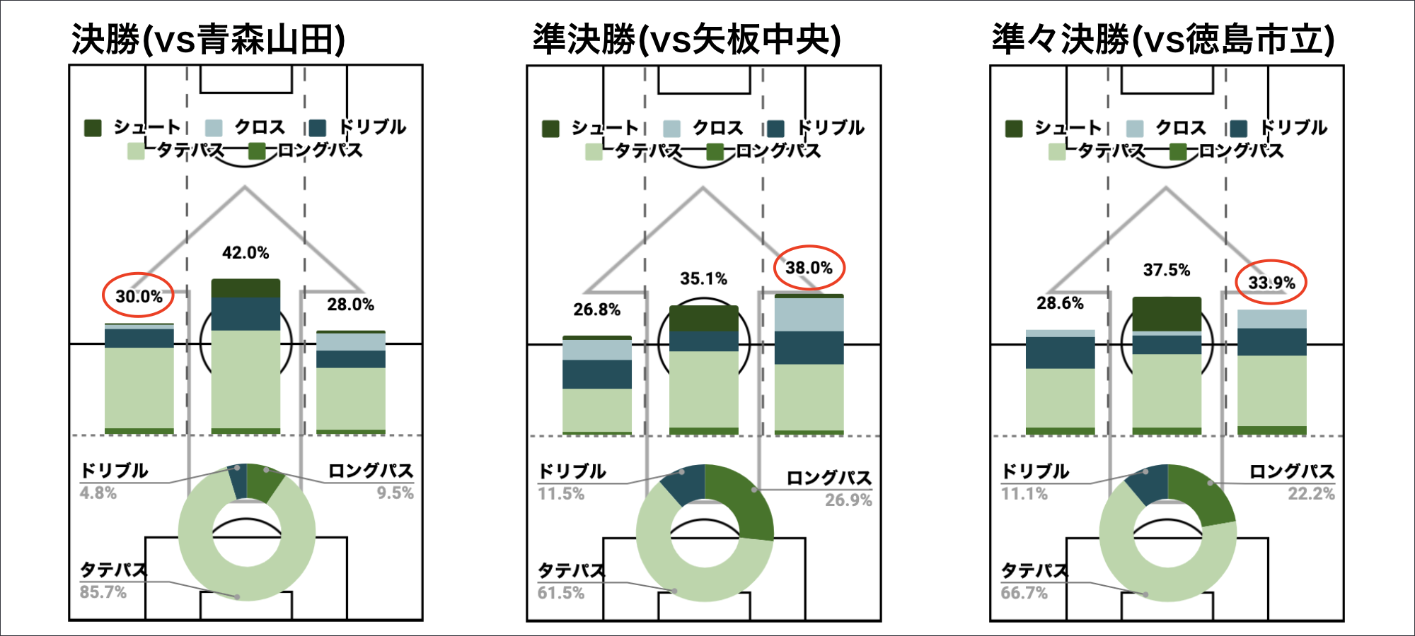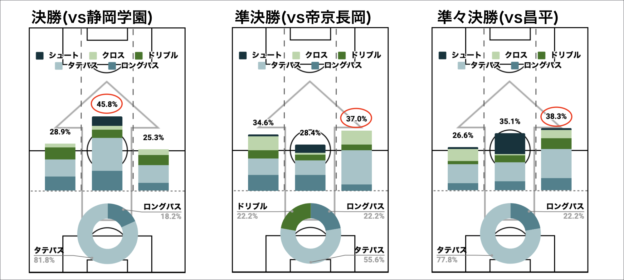 攻撃の両サイドを比較すると、準々決勝(vs徳島市立)、準決勝(vs矢板中央)では右サイド、決勝(vs青森山田)では左サイドの方が割合が大きかったです。
