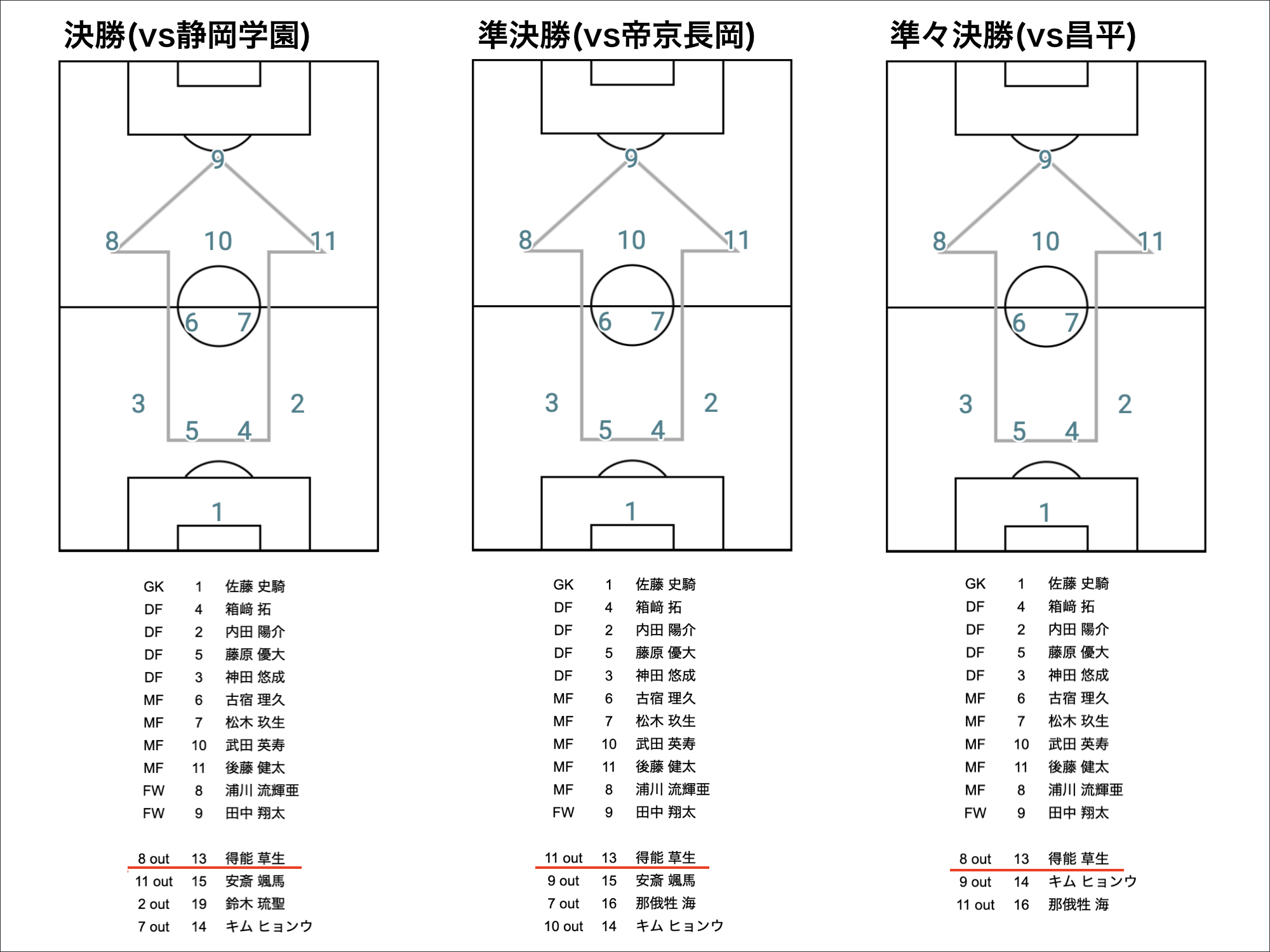 決勝(vs静岡学園)、準決勝(vs帝京長岡)では6番の古宿選手も多くプレーに関わっており、攻撃の起点になっていました。準々決勝(vs昌平)ではプレーは多くなかったですが、ボランチより前の高い位置でボールを奪い攻撃につなげる頻度が高めに。