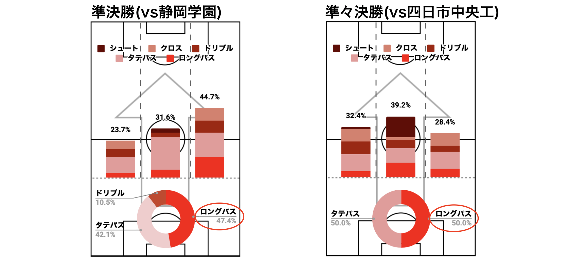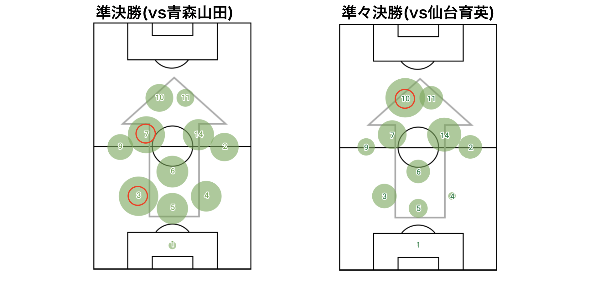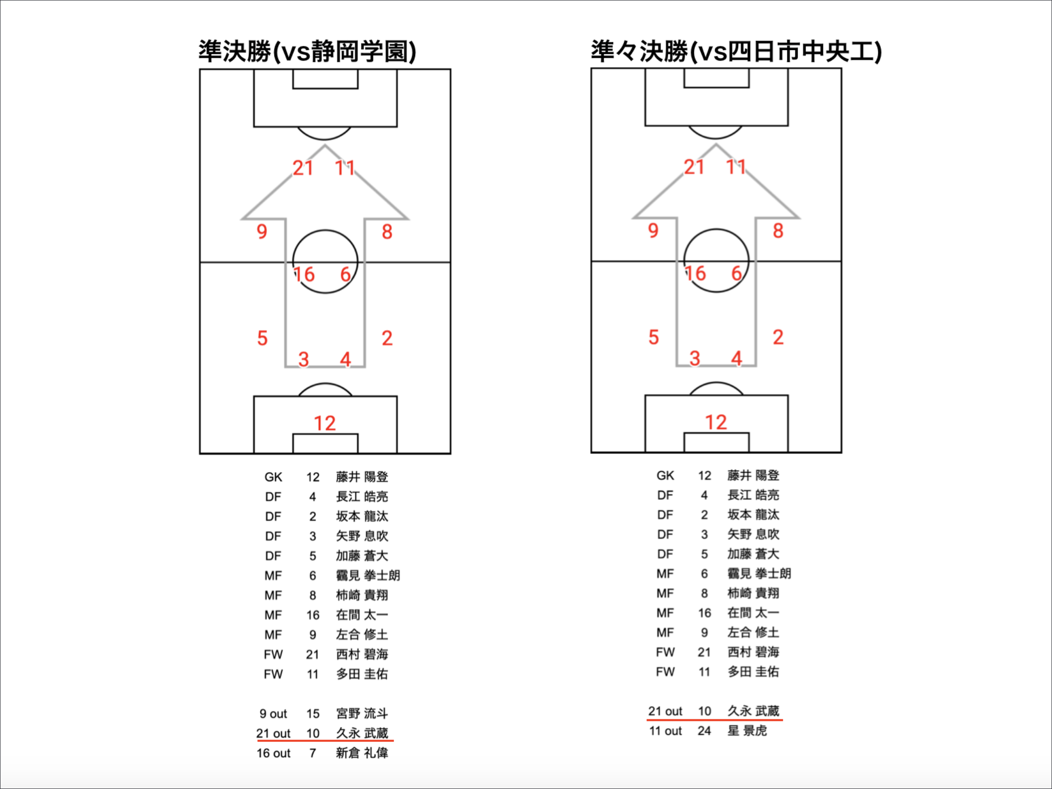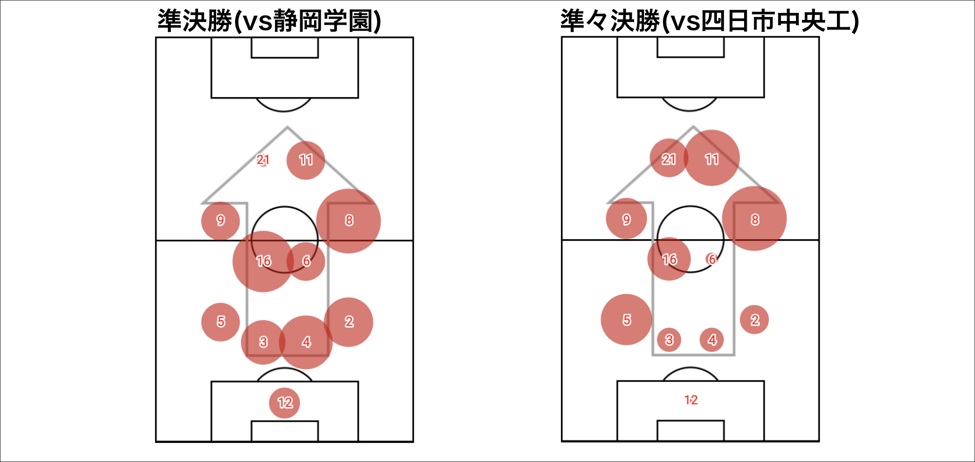 準決勝(vs静岡学園)では静岡学園に押し込まれ、FWの選手がプレーする機会は少なかったです。一方、準々決勝(vs四日市中央工)ではボランチから前の選手が多くプレー。