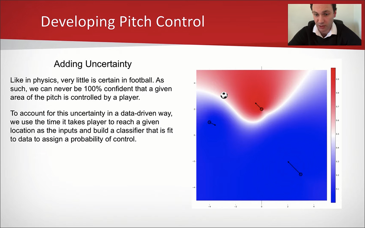 これが「Pitch Control」の基本的な部分です。選手がボールをコントロールする確率が高い領域を可視化することで、試合の様々なシーンをより効果的に分析し、最適化を図ることができる訳です。