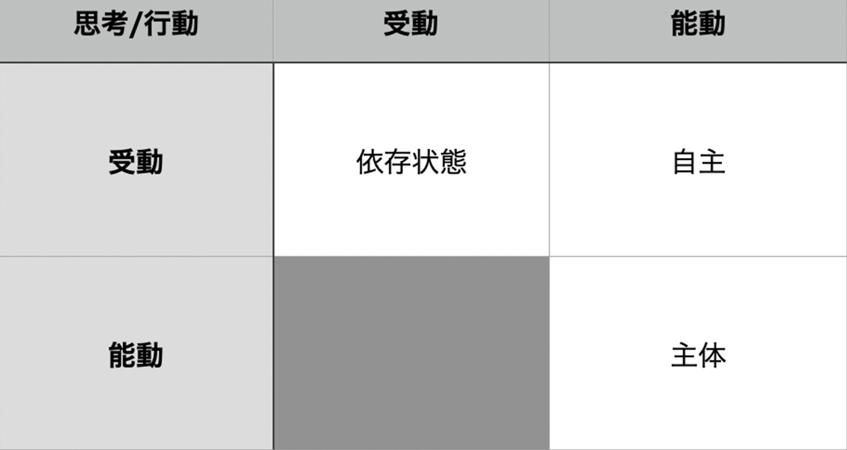 ①依存状態(受動×受動) → ②自主(受動×能動) → ③主体(能動×能動)