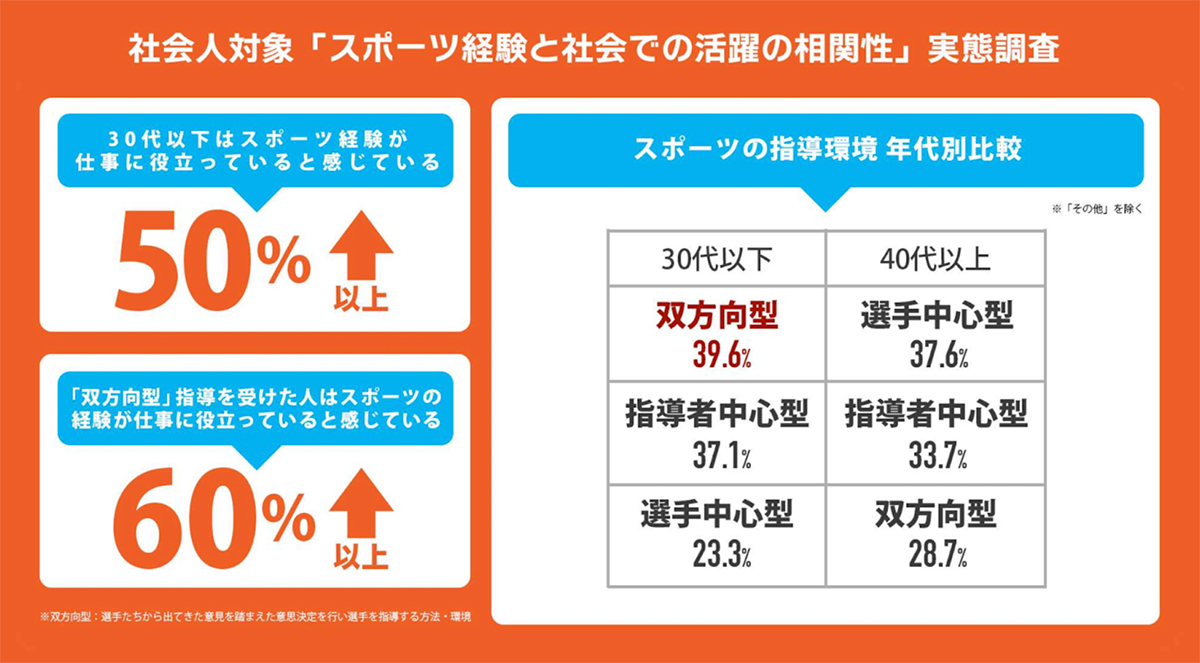 【スポーツの教育的価値とは】双方向型の指導を受けた約6割が「スポーツ経験が仕事に役立つ」と実感