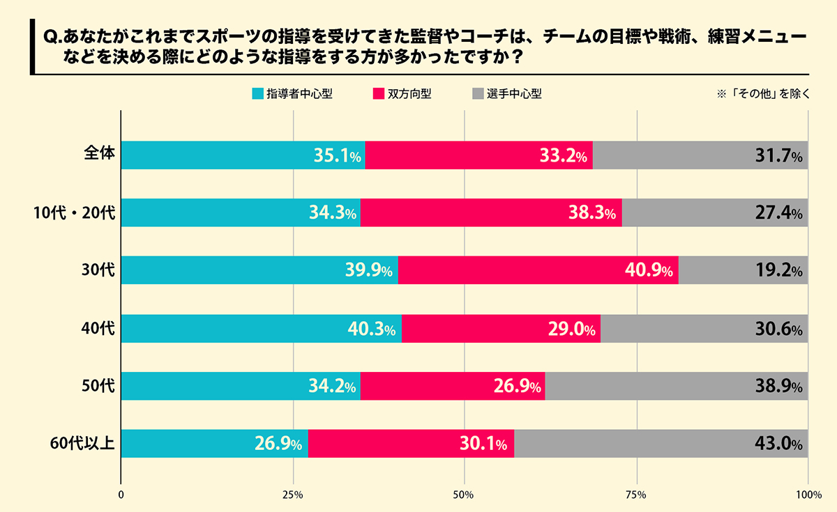 - これまで受けてきたスポーツの指導環境は、「指導者中心型※1」が35.1%、「双方向型※2」が33.2%、「選手中心型※3」が31.7%。年代別に見ると、10~30代は「双方向型」が多い。40代以上は「双方向型」が最も少なく、「指導者中心型」「選手中心型」が多い傾向に【図2】