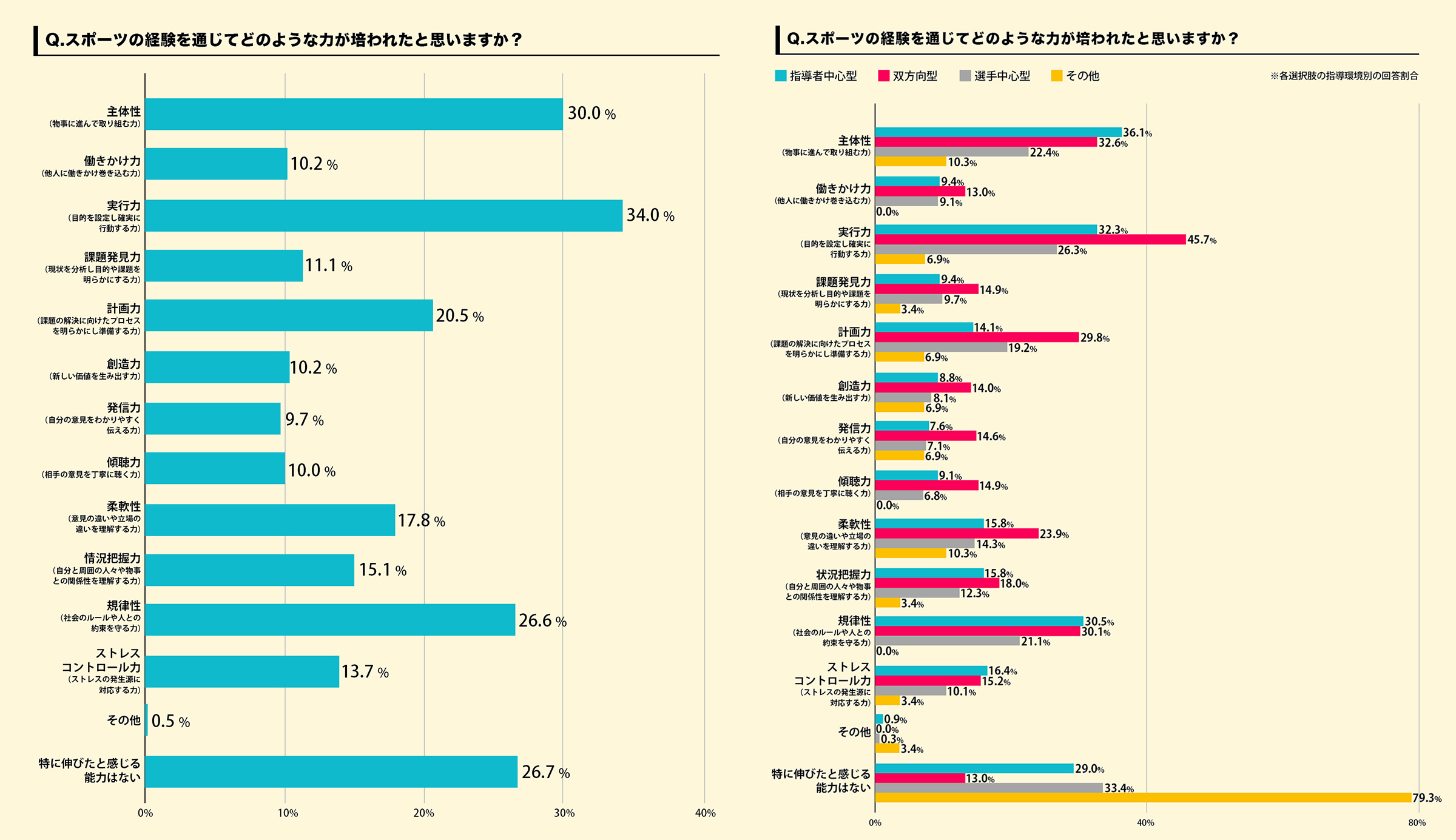 - スポーツの経験を通じて全体としては「特に伸びたと感じる能力はない」との回答が26.7%と3番目に多いが、「双方向型」の指導を受けた人は「特に伸びたと感じる能力はない」の回答が13.0%と最小値【図4-1,図4-2】