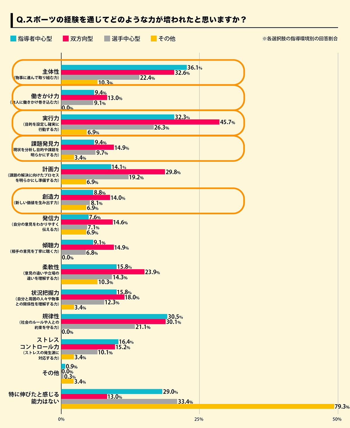 つまり、この2つのアンケート結果を横断して解釈すると、過去のスポーツ経験で「双方向型」の指導を受けたグループは、"企業が大卒者に期待する資質や能力"に類似する力が培われたと感じている傾向が他の指導グループと比較して高いことが読み取れます。