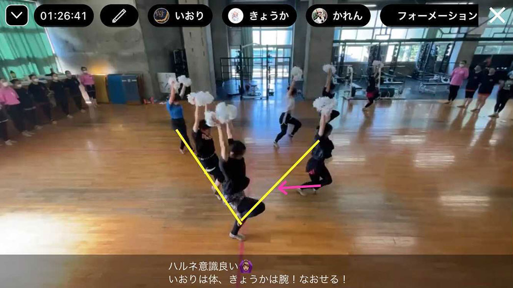 SPLYZA Teamsは動画の速度を変えられるじゃないですか。チアはアームスの軌道などの動きの軌道をゆっくりにして見ているんです。前までは個人個人に癖があって違う踊りのようだったのですが、腕の位置や動きをSPLYZA Teamsの速度機能を使って、みんなでひとつの踊りになるようにできてきました。細かいところまで見られるので、質の高い練習ができるようになったかなと思います。