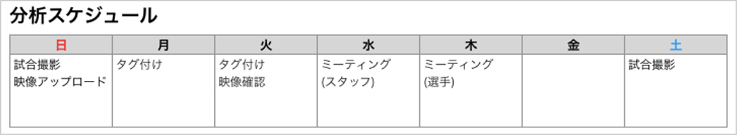 自チームの分析に関しては、試合がある日曜日に映像をアップロードして、月曜日の夜~火曜日の早朝までにはタグ付けを終わらせます。そこから監督やコーチとテクニカル班が映像を確認しながら分析して、水曜日に監督とテクニカル班でミーティング→木曜日に選手たちとSPLYZA
