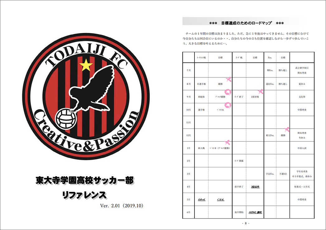 はい。粉河高校の脇先生が書かれた「プレー経験ゼロでもできる実践的ゲームモデルの作り方」と、元サッカー日本代表監督でもある岡田武史さんの「岡田メソッド」を熟読しまして、それらをベースに東大寺学園高校サッカー部のリファレンスを作成し、生徒達に配布しました。ゲームモデルに準じたチームの目標、プレースタイルやプレー原則、あとは目標達成のためのロードマップ等が明記されていて、全部で30ページほどあります。