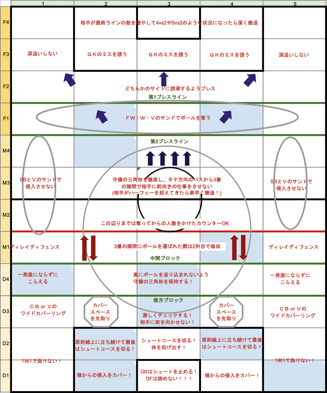 ↓東大寺学園高校サッカー部、守備におけるフィールド上でのタスクマップ