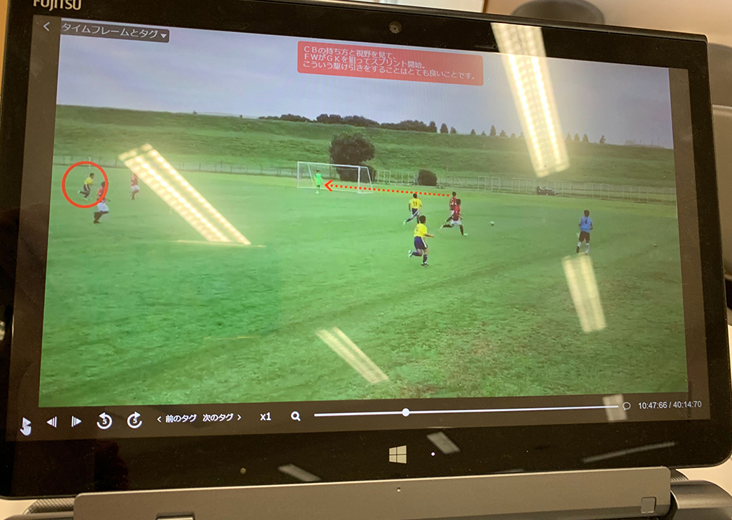 ここから始まって一連の流れがあって、こうなった時はこうしてなくちゃいけない、という解説を映像に書き込んでます。今僕は1年生のカテゴリなので、チームの最低限のルールの部分をある意味教え込まなくちゃいけない。そういう時に、映像を使って解説を書き込んで一気に教えるために使っています。