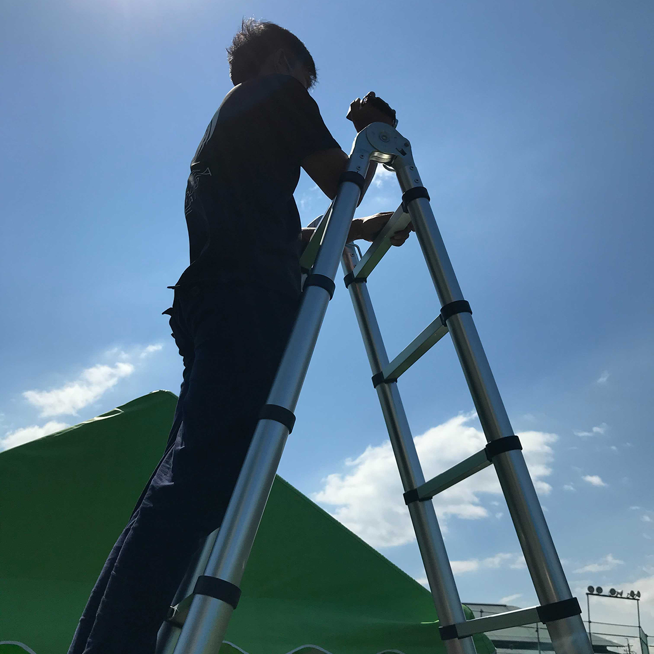 ここで、デメリットもお伝えしておきます。それは重量です。この伸縮ハシゴは20kgもあるのでかなり重いです。学校で置いておくだけであれば大きな問題は無いのですが、他の会場に運ぶには必ず車で移動させなければ危険です。車からグラウンドまで距離がある場合も一苦労。この点は必ず考慮に入れて頂ければと思います。