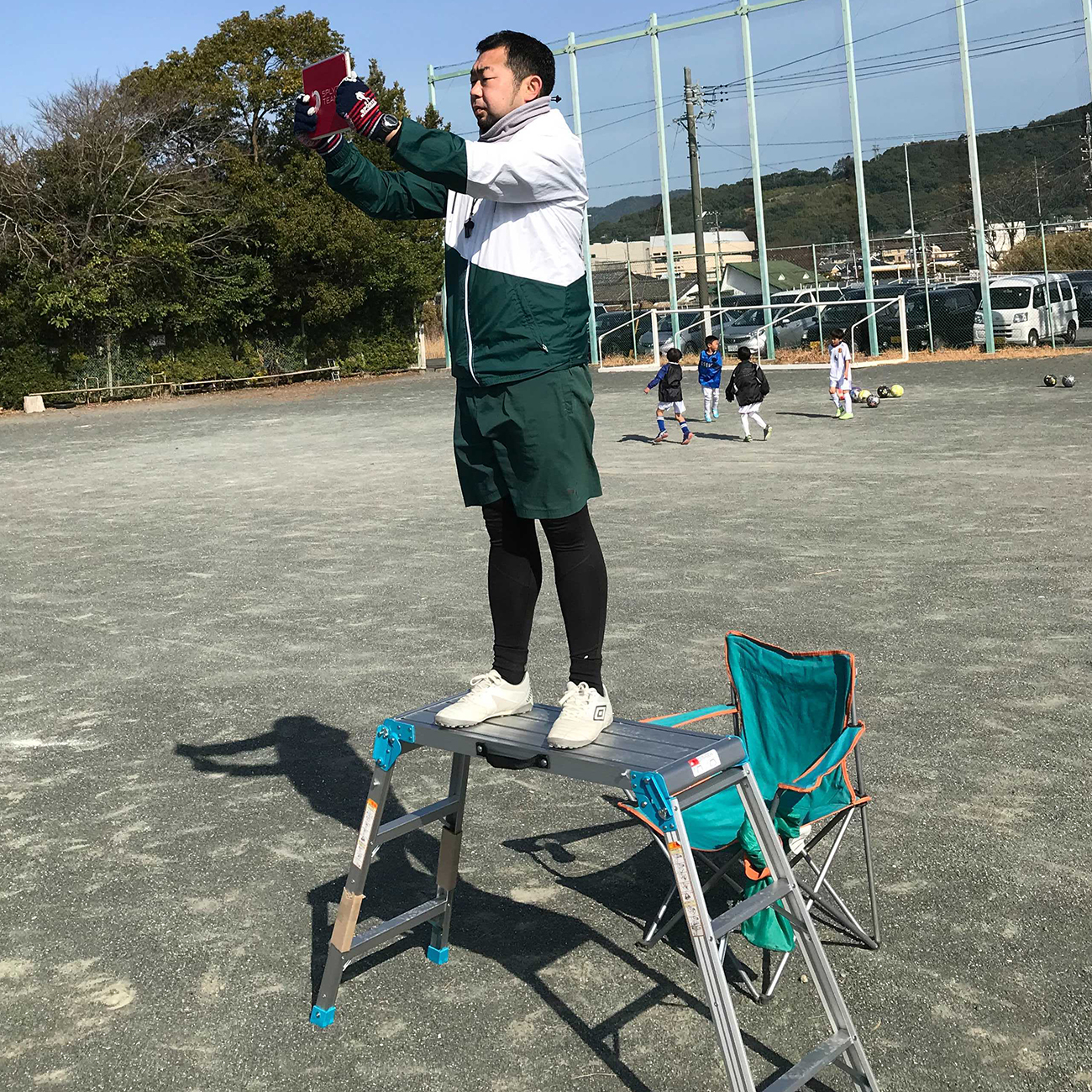 アルミ作業台は筆者が小学生のサッカーチームでも実際に利用している高所撮影機材です。Amazonや楽天市場で「アルミ作業台」で検索すれば様々なものが出てきますが、私がホームセンターのCAINZで購入したものでご紹介させて頂きます。