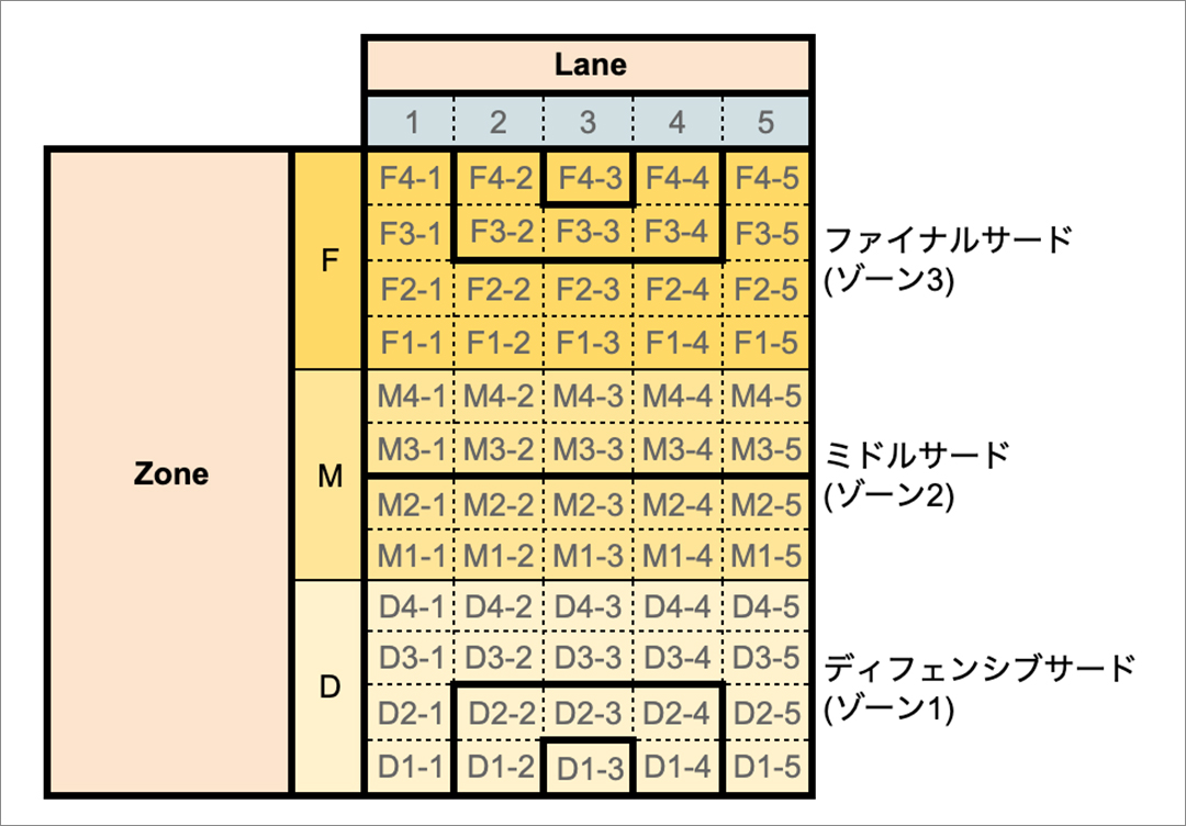 スプレッドシートの「タグ付けの定義」シート内にもありますが、ここでグリッド上に仕切っている各エリアの名称を決めていきます。ここでは縦を大きく3分割(例としてディフェンシブサードの「D」、ミドルサードの「M」、ファイナルサードの「F」)した上で更に内側を4分割し、合計で縦に12分割。そして横に5レーンとして5分割。グリッドとしては60個の箱が存在することになります。つまりこの各エリアでのタスク実行頻度や可否を判断し、分析していくという流れになります。これらはチーム内で使いやすい呼称にカスタムしていただければと思います。