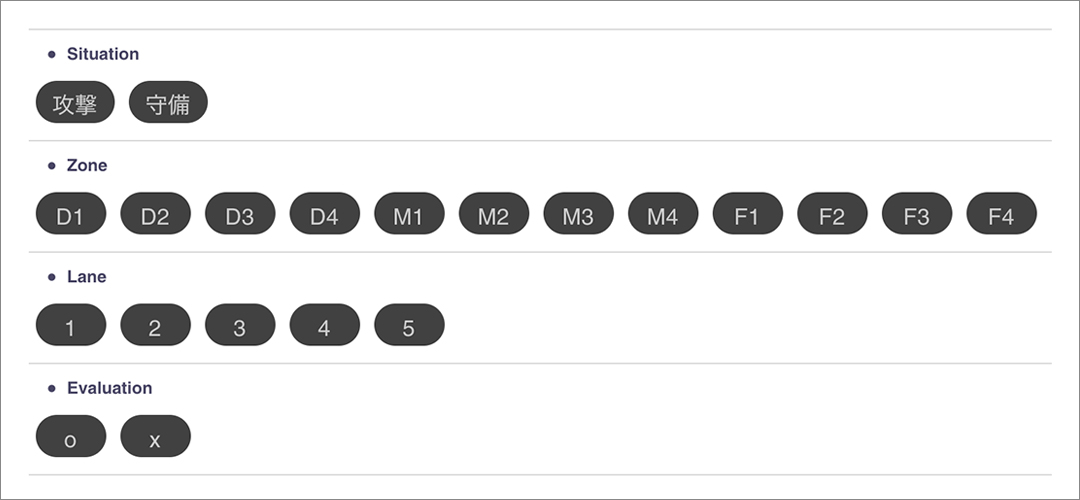 STEP2で設定した内容をSPLYZA Teamsのタグに登録していきましょう。タグのカテゴリとしては4つ、局面(Situation)、縦12分割のゾーン(Zone)、横5分割のレーン(Lane)、評価(Evaluation)としています。こちらは文字化けしなければ日本語で登録しても問題ありません。またこちらでは縦と横のエリアを別々に登録していますが、特に縛りはありませんので各自やりやすい方法で構いません。
