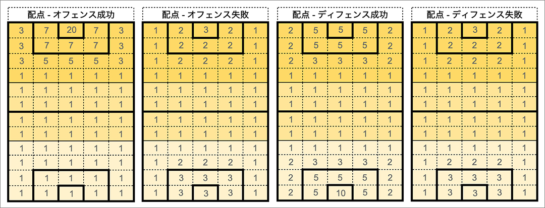 スプレッドシートの「タグ付けの定義」のシートで設定を行います。こちらで配点は予め入力していますが、チームごとに配点を細かく設定していただければと思います。オフェンスの際、敵陣の深い位置でタスクを成功すると高ポイント、またディフェンス時に自陣ゴールに近ければ近いほど(失敗の)配点が高いと言った具合になります。順番が後に回ってしまいましたが、こちらはSTEP2あたりで一緒に設定をしておくと良いでしょう。