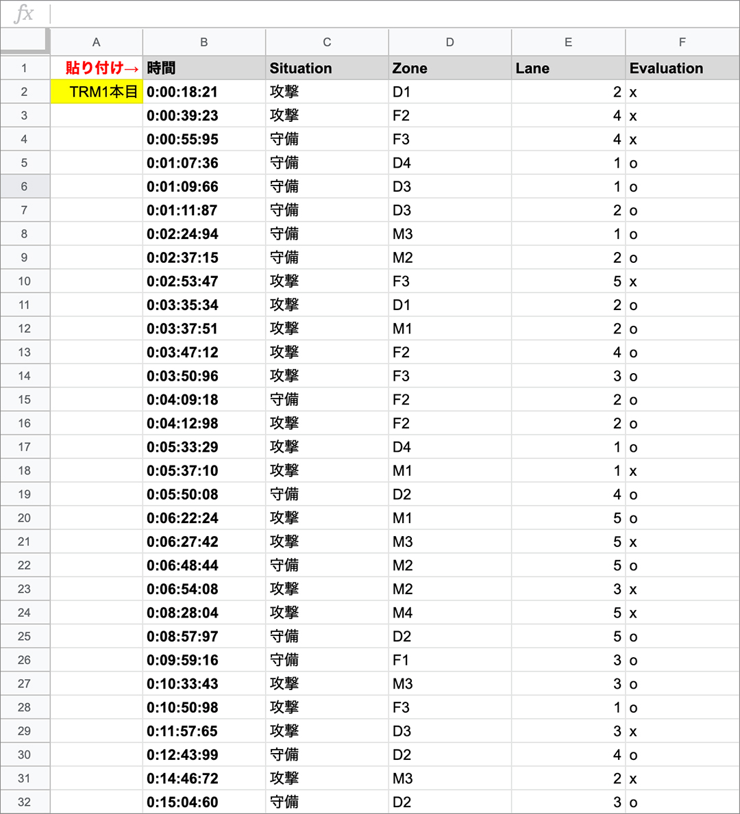 1試合分タイムタグを付け終わったら、編集を完了してタイムタグをCSVで書き出します。そして該当する4列をコピーし、スプレッドシートの「タグ貼り付け用」シートにペーストします。