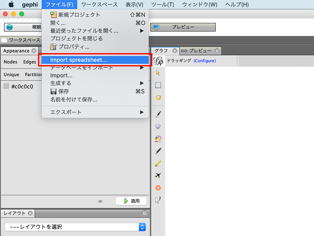 Gephiを起動→「ファイル」→「import spreadsheet」を選択し、あらかじめダウンロードしていたGEXFファイル(vissel.gexf)を選択します。