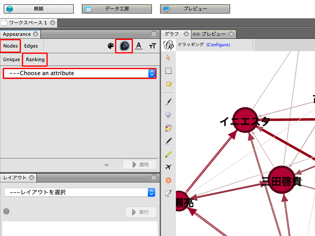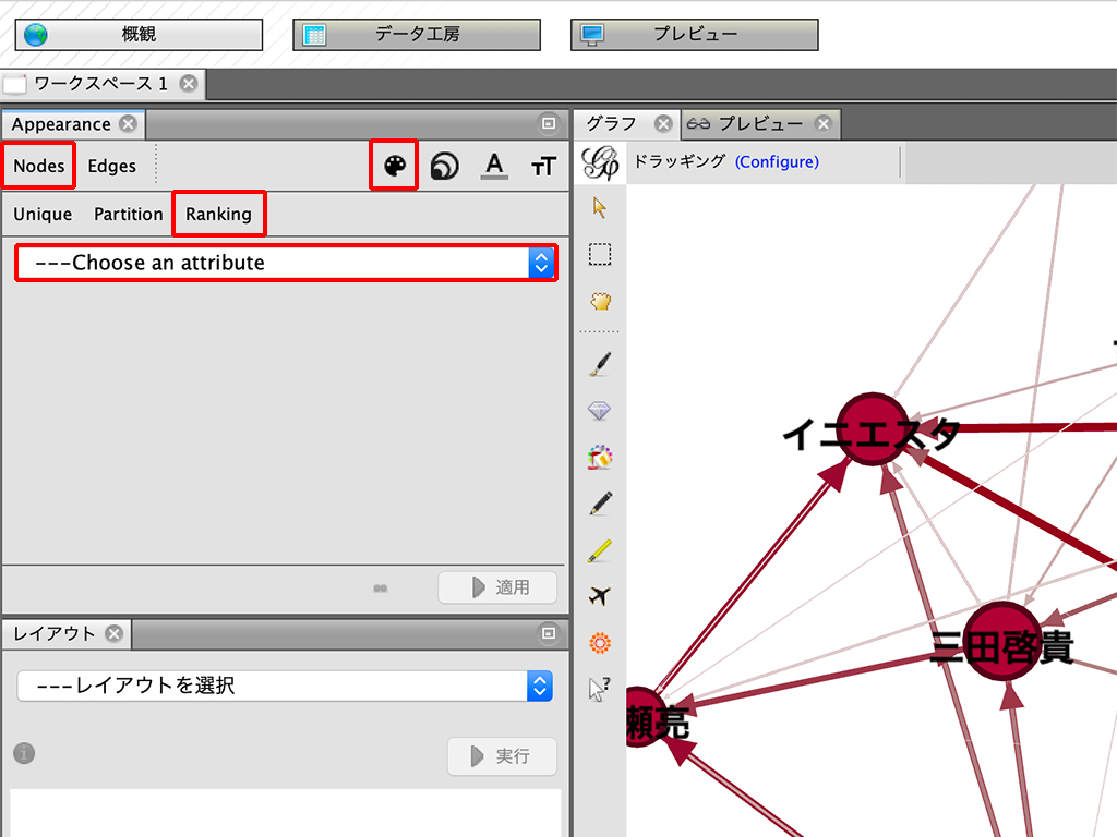 まずは選手ノードの大きさ調整から。「Appearance」の項目でノードのアイコンをクリックし、「Nodes」→「Ranking」の順に選択するとプルダウンが表示されますので「Degree」を選びます。