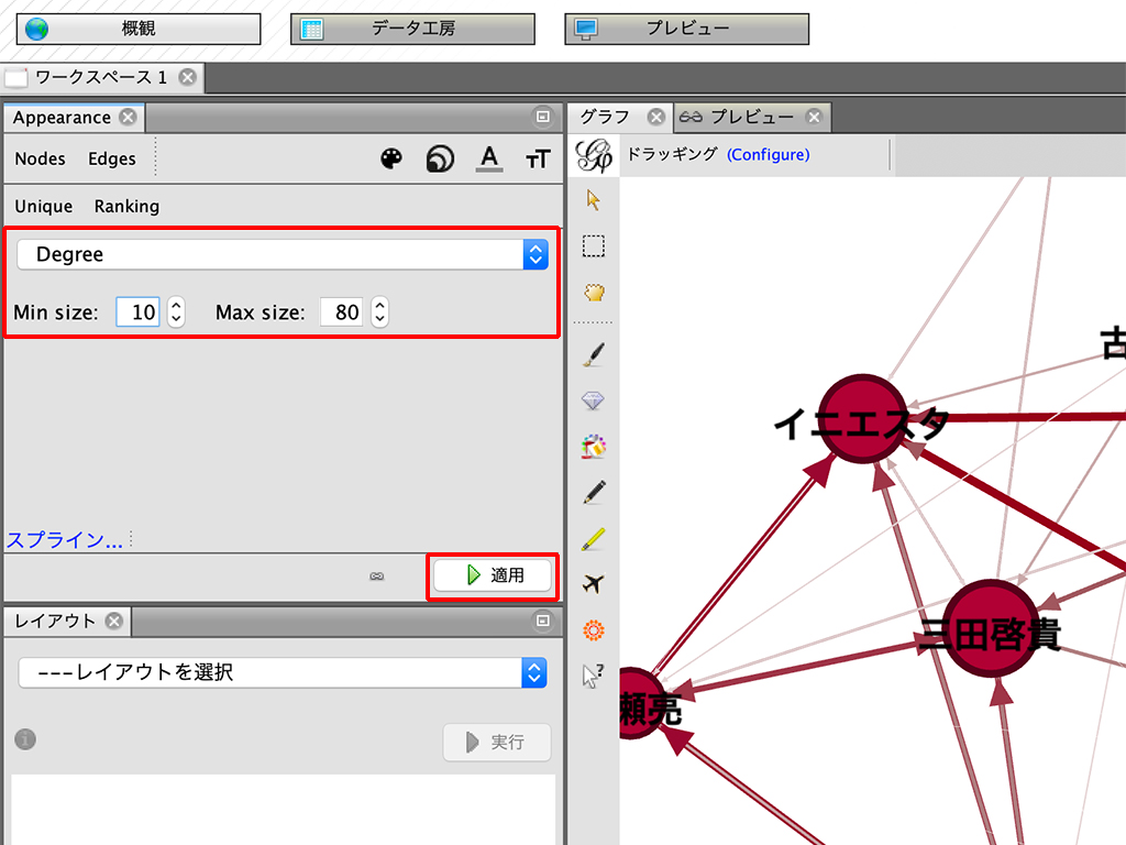 Min sizeとMax sizeを任意で設定し、「適用」をクリックするとノードの大きさが相対的な大きさで適用されます。