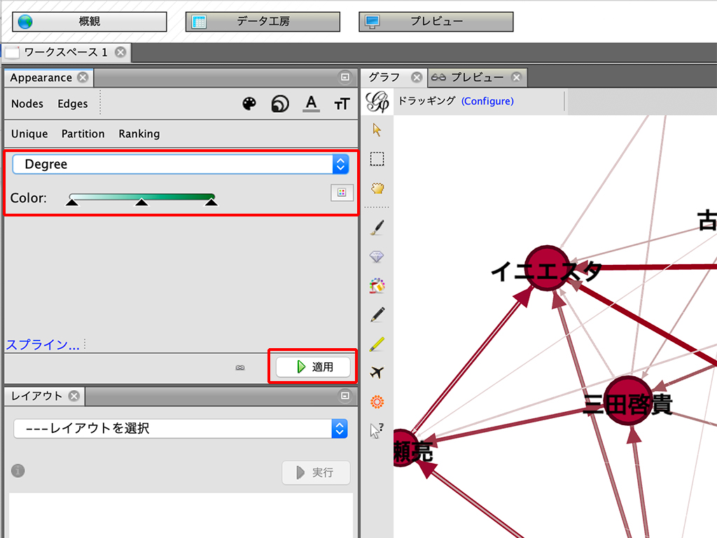 次に選手ノードの色を設定します。再び「Appearance」の項目で絵の具パレットのアイコンをクリックし、「Nodes」→「Ranking」の順に選択するとプルダウンが表示されますのでこちらでも「Degree」を選びます。