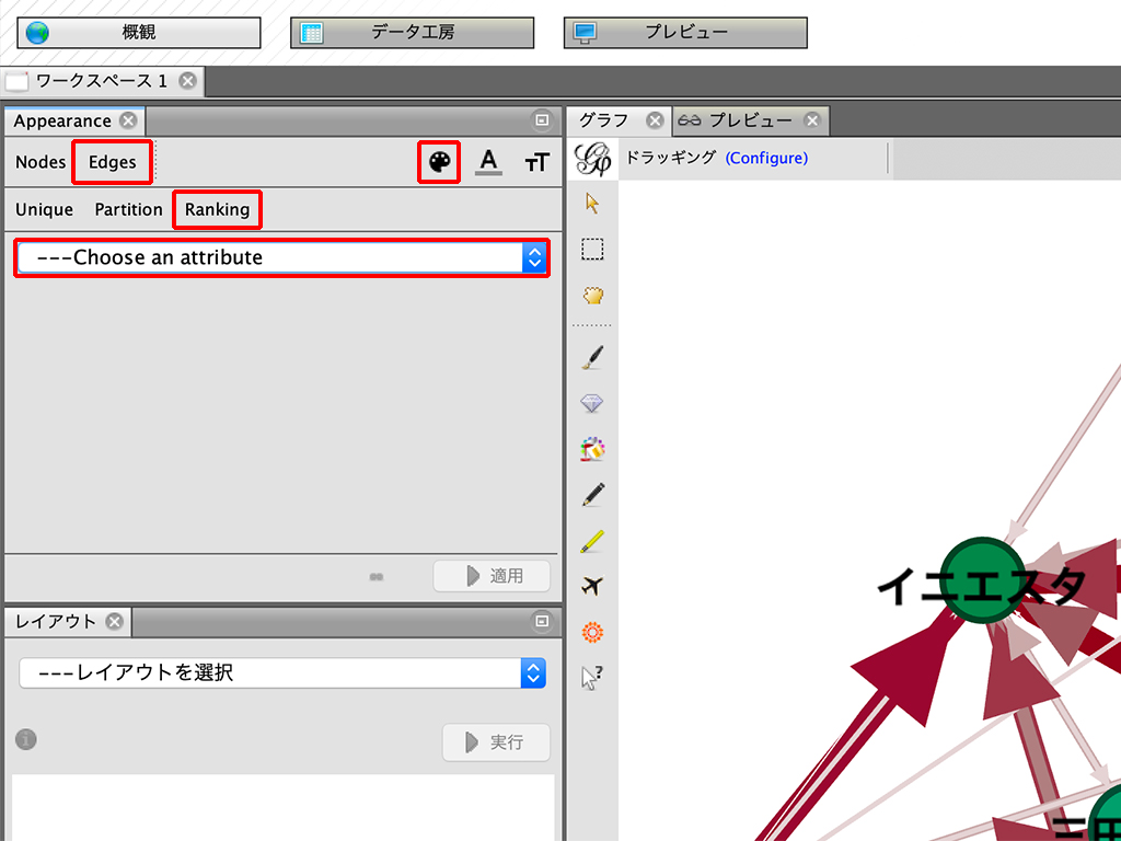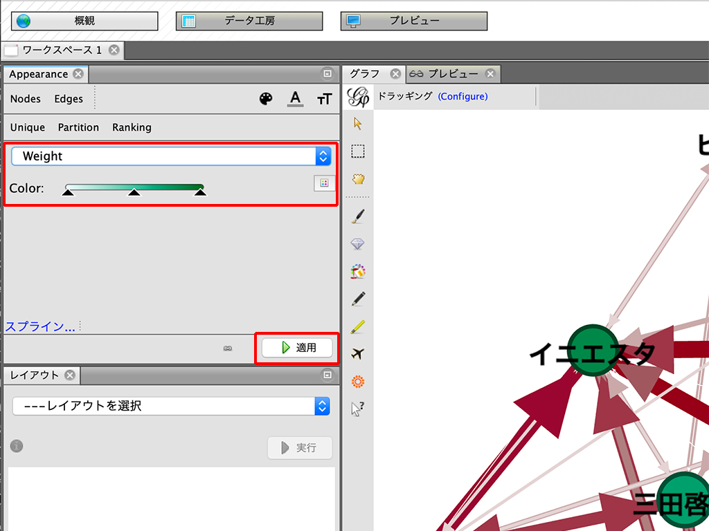 パスルートの色を設定します。選手ノードと同じく「Appearance」の項目で絵の具パレットのアイコンをクリックし、「Edges」→「Ranking」の順に選択するとプルダウンが表示されますので「Weight」を選びます。