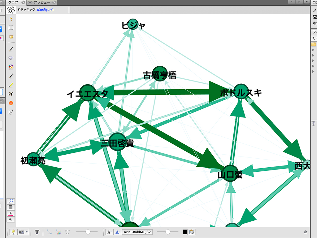 ・edge weight=”選手aから選手b間でのパスの成功した回数”