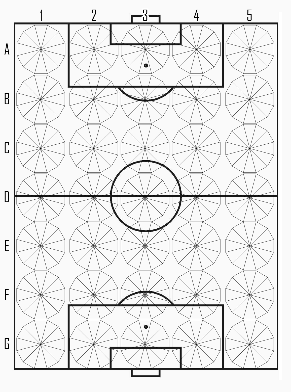 上で紹介しているStatsBombのやつは5×6の30個ですが、絵的な収まりが5x7の35の方がいいので取得用シートはそうしてます。あとパス方向の目測も12くらいが限界だと思うので12角形をずらっと並べてます。各々お好きなようにカスタマイズしていただければ。