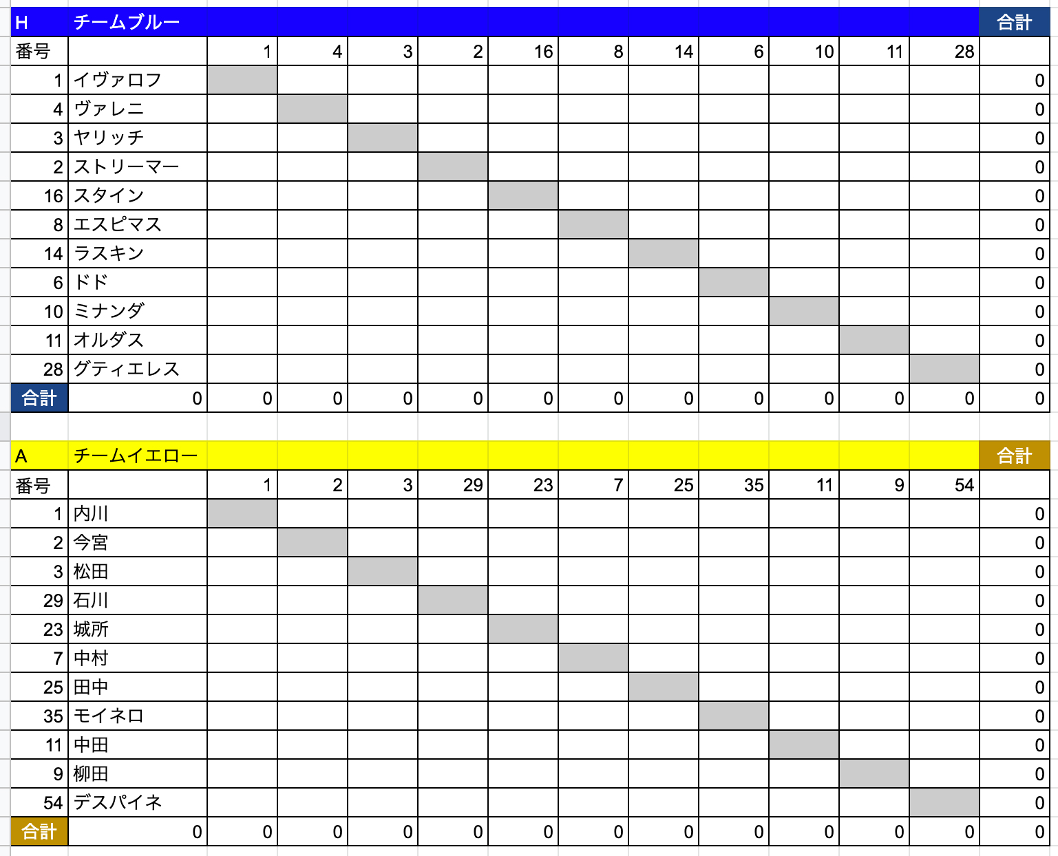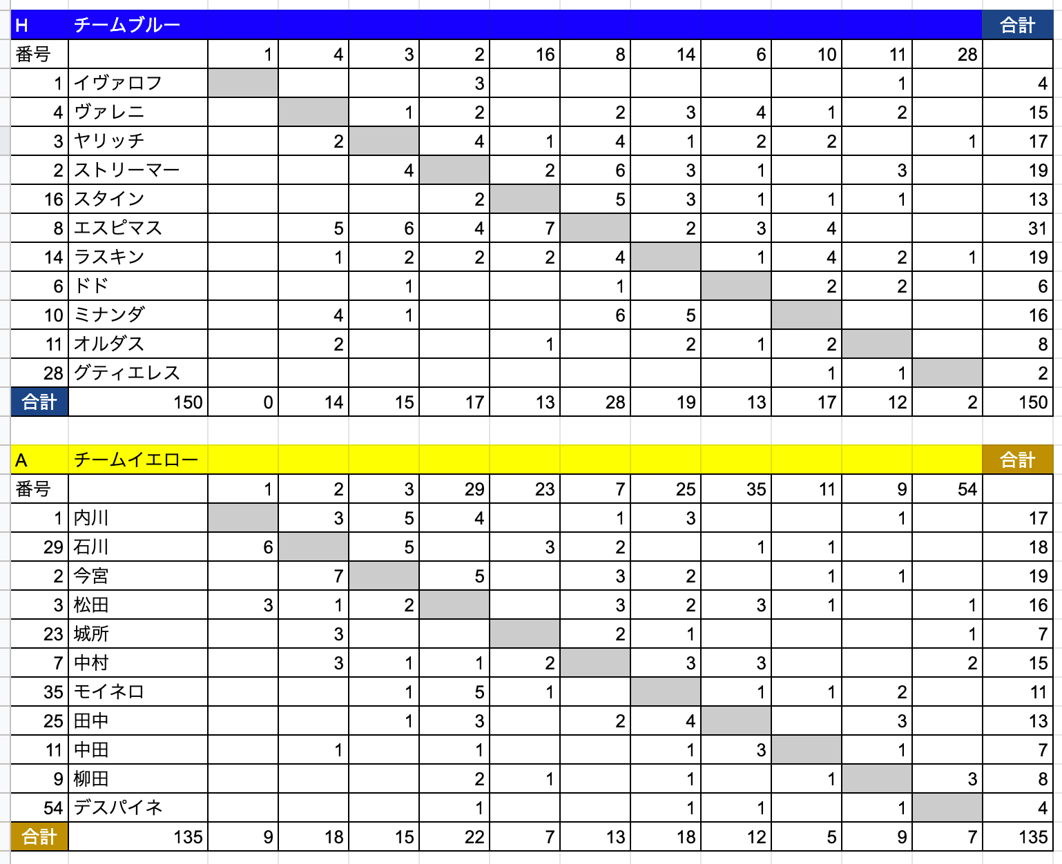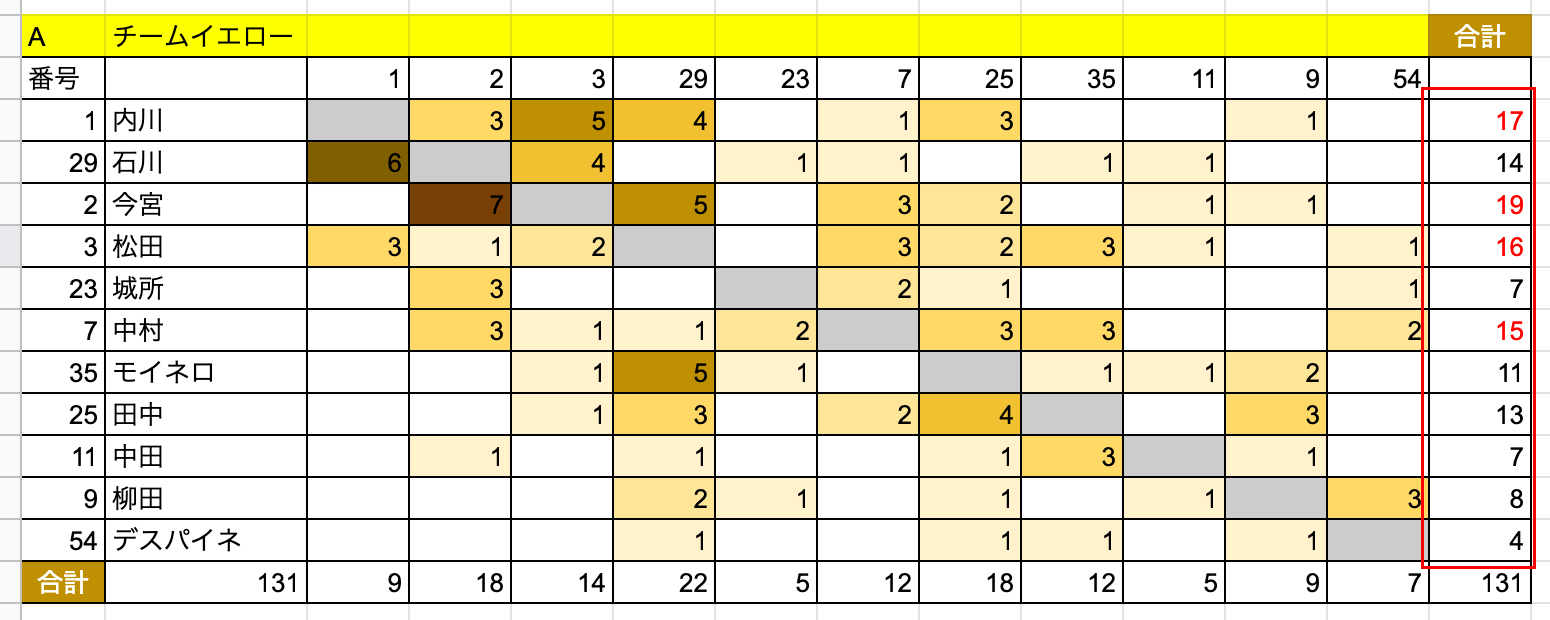 のっけから最大の山場ですが、大事な作業になります。まずはスプレッドシートでこのような表を作りましょう。今回はパスデータ(誰が誰にパスを出して成功したか)を取得していきます。左側(y軸)がパスの出し手、上側(x軸)がパスの受け手となるように表を作ります。選手名や背番号をしっかり明記しましょう。あらかじめSUM関数で合計の値が出るようにしておくのもポイントです。