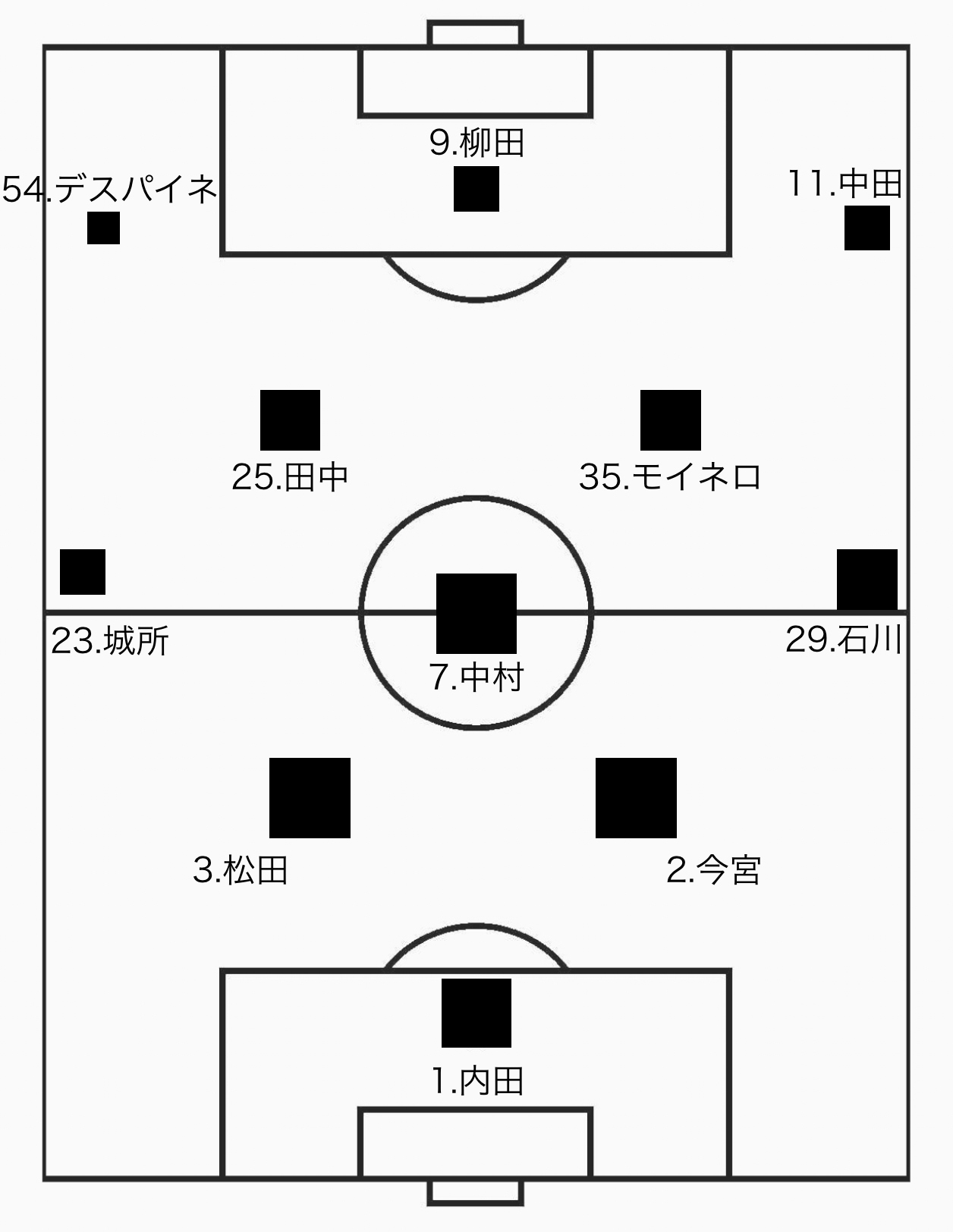 ちなみにこちらのまっさらな画像をダウンロードしてお使いいただいてもOKです!このフィールドの画像をスライド作成ツールに背景として配置します(今回はMac版のプレゼン資料作成ツールの定番であるKeynoteにて作業を行います)。手始めに選手の名前と、各選手のパスの出し手としてのパス成功数をもとに四角形を描画していきます。
