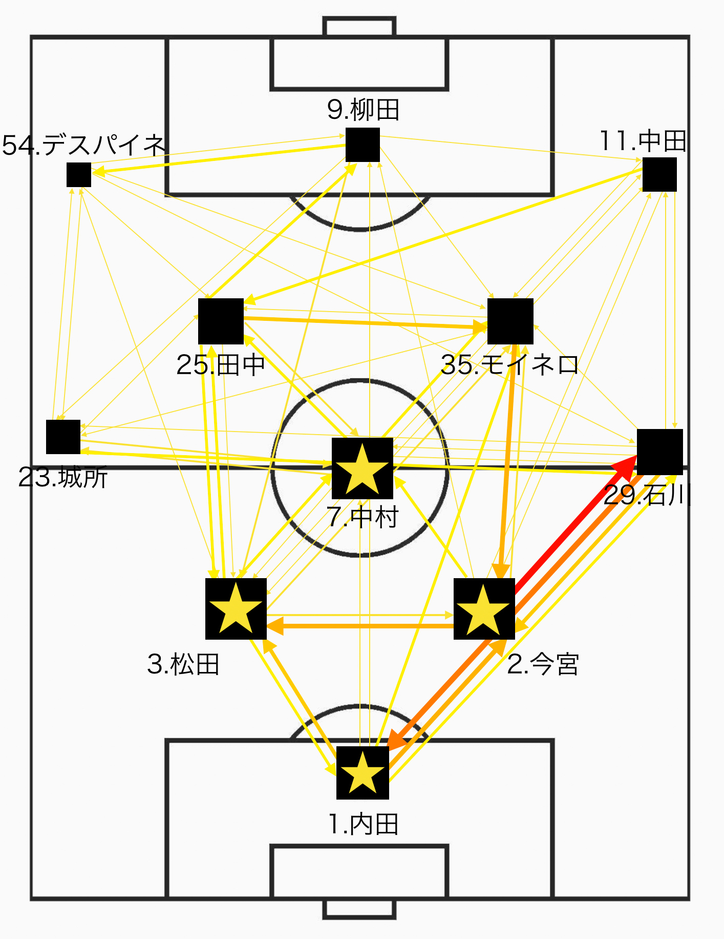 全ての選手を矢印でつなぎました。仕上げとして選手名と選手を表す図形を最前面に指定し、パスコンビネーションで赤文字にしていたパス成功を多くできていた選手に星をつけましょう。これで完成です!このようにフィールド上に様々な矢印を配置することで誰と誰の間で頻繁にパス交換が行われているか、もしくは全く行われていないかが非常に明瞭に可視化できるようになりました。それらが自チームのコンディションによるものか、または相手チームのプレッシングやブロックなどの意図的な干渉により起きているのかは、お互いチームの定性分析をしていく中で、冒頭でも触れた「定量的な評価基準」を加えることで、より精度を上げていくことが可能になるかと思います。
