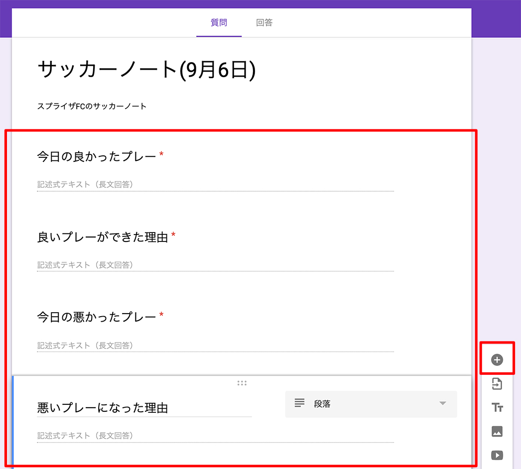 次に入力項目をどんどん入れていきます。右側のメニューバーにある「+」ボタンで新規で項目を追加していきます。