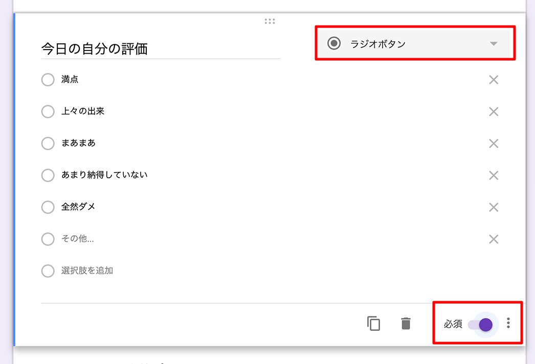 テキスト入力以外にもラジオボタンやチェックボックスなど様々な入力形式を選択できます。また必須項目も右下のスライドボタンで設定できます。