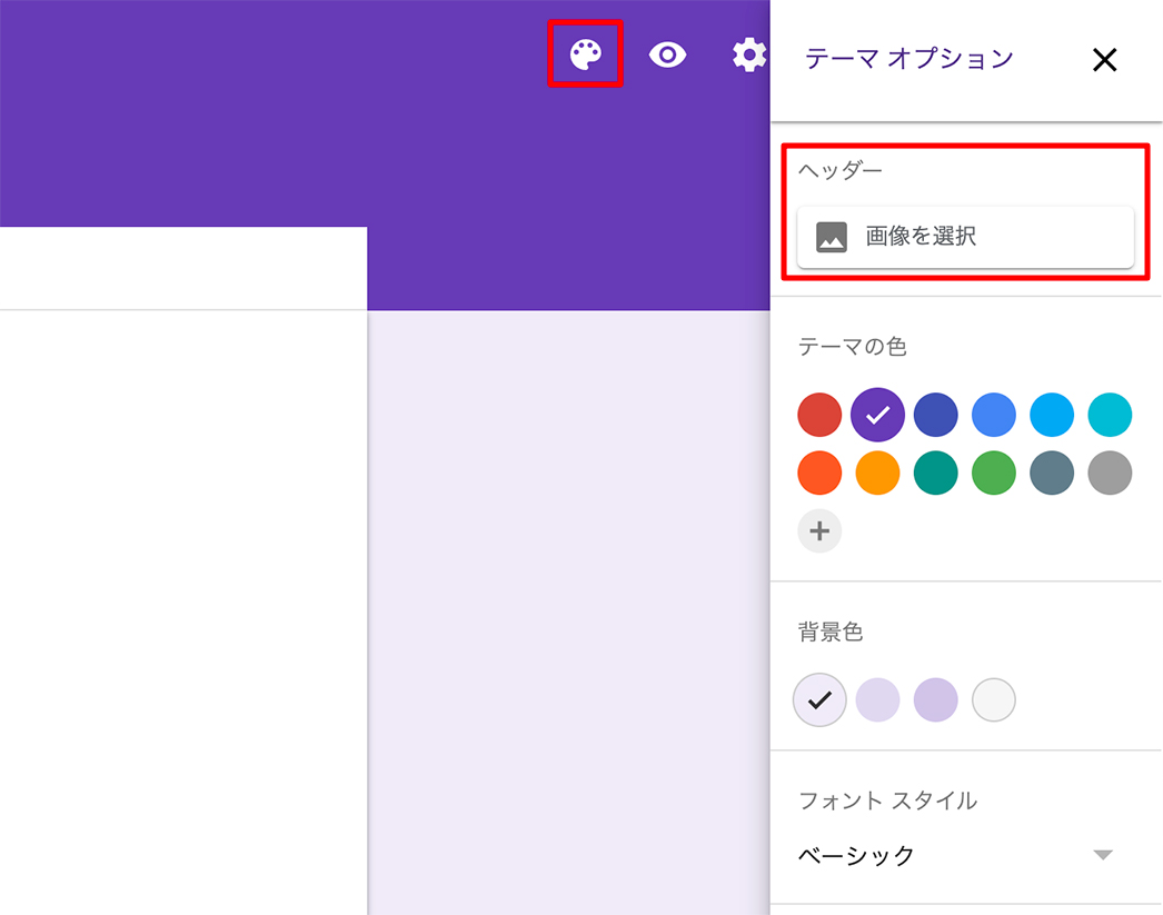 フォームの項目設定が終わったらフォームの見た目を変更してみましょう。右上にある絵の具アイコンをクリックして「ヘッダー」>「画像を選択」を選びます。