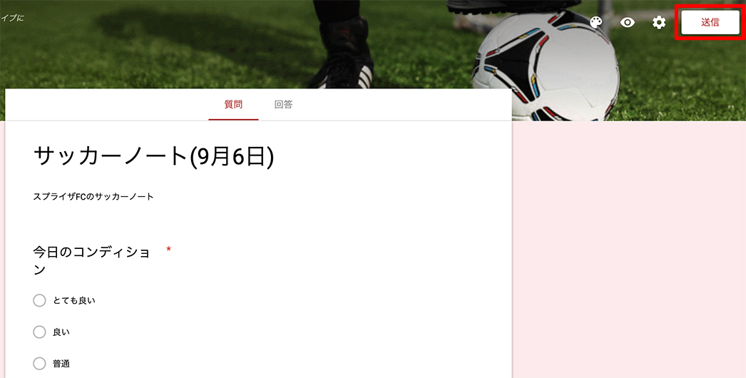 サッカーノート用の入力フォームが完成しました。それではこのページのURLを共有しましょう。右上の「送信」ボタンをクリックします。