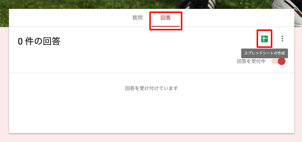 入力フォームから投稿される内容を管理するためのスプレッドシートを予め作成しておきましょう。「回答」のタブを選んでスプレッドシートのアイコンをクリックします。