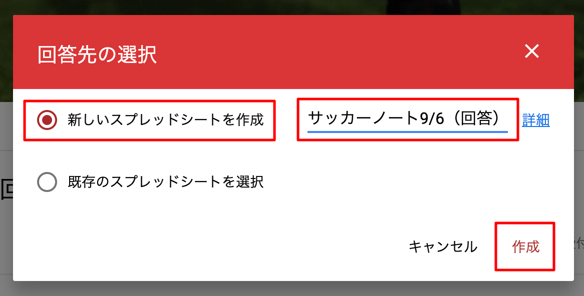「回答先の選択」の小窓が表示されますので、「新しいスプレッドシートを作成」のラジオボタンを選択し、タイトルを入力したのちに「作成」をクリックします。