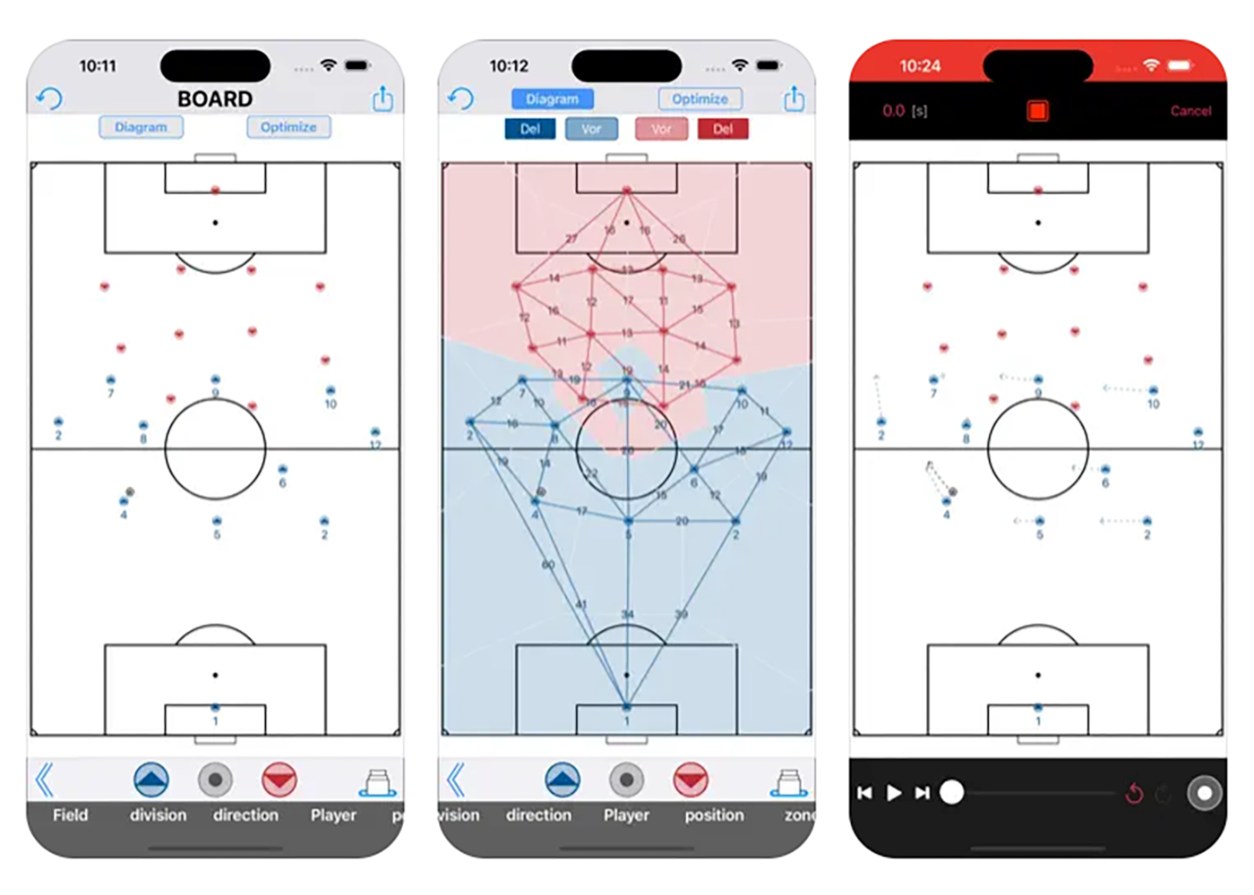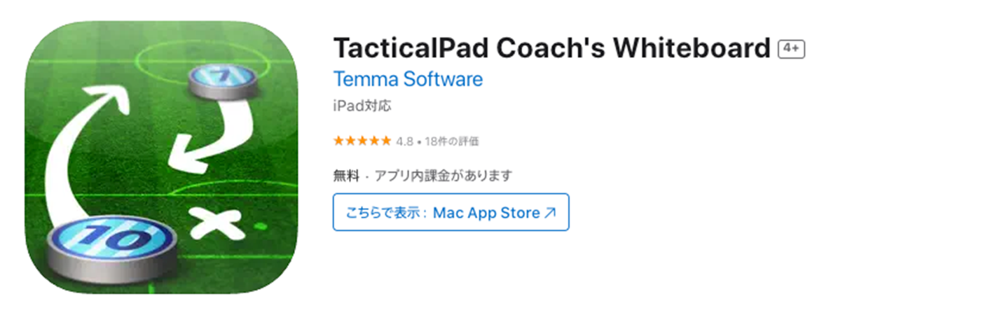 一般的な戦術ボードに近いアプリ。アイコン移動や書き込み機能が備わっていて、細かな設定ができ、アニメーションの作成も可能。また、選手のゾーンを表現できたり、選手間距離を表示したり、選手同士が保有するスペースを可視化したりなど、特殊な機能も備わっている。実際のフィールドに対するサイズ感を意識して、戦術を組み立てたり、伝えたい時に役立つアプリ。手元で戦術を検討したい人にオススメ。