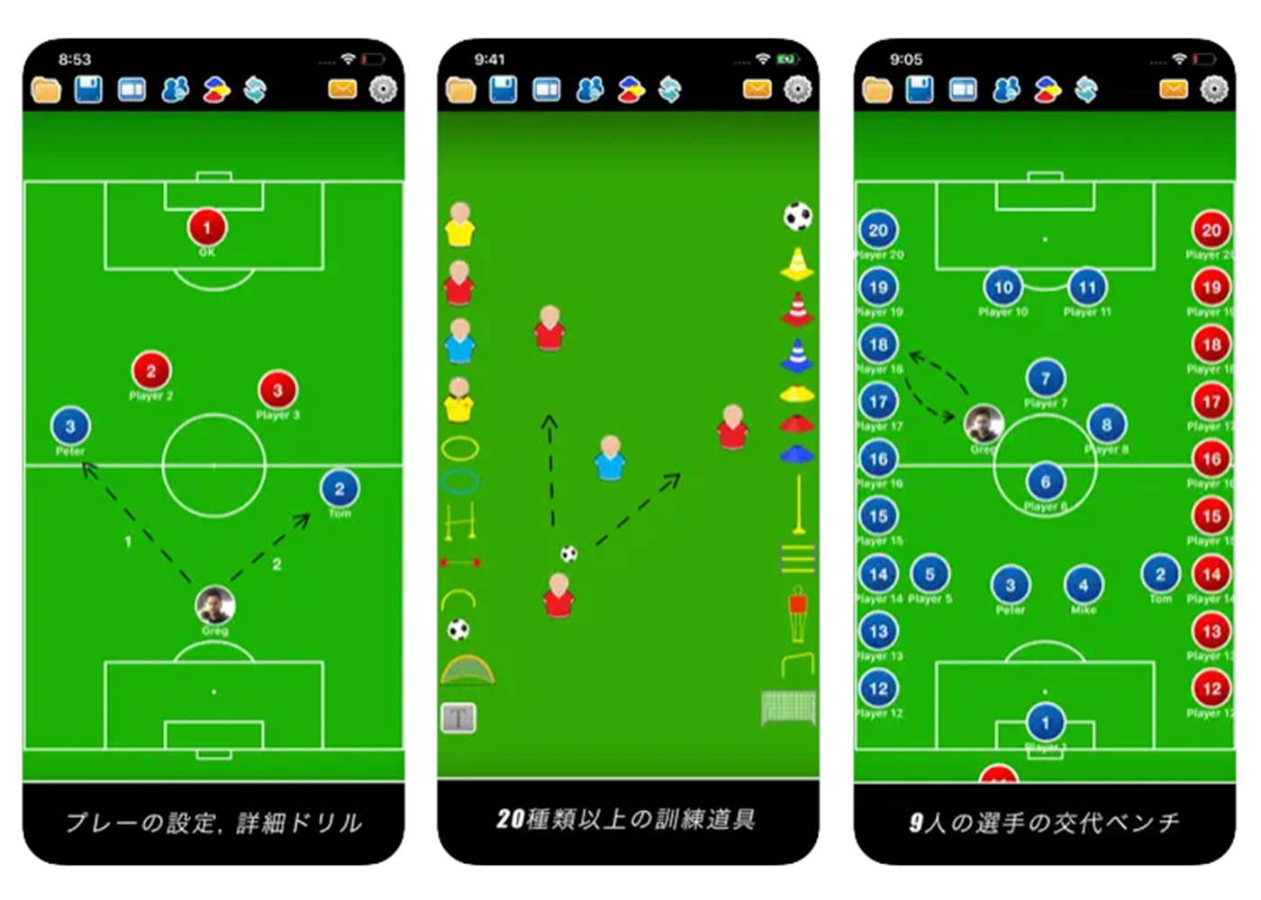 Android版もある描画アイテムが豊富なアプリ。アイコン移動や書き込みなど戦術ボードの機能は備わっていて、アイコンを変えたり画像を入れることも可能。カラーコーンのスタンプなどもあり、トレーニングメニューを作ることもできます。それらを保存したり、動きのアニメーションを作ることができるのが面白い。試合だけでなく練習のイメージを伝える時に役立つアプリ。