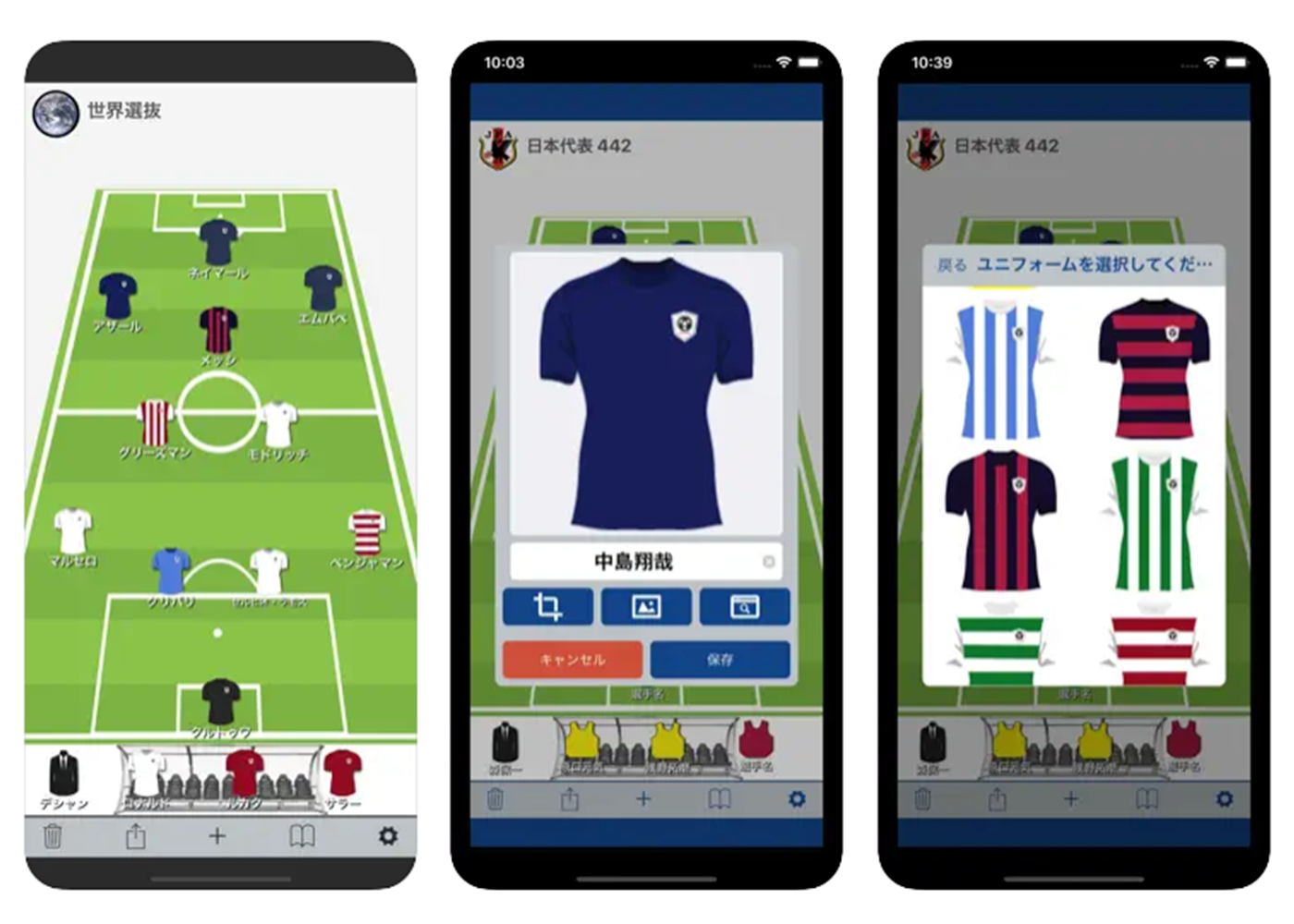 チームのラインナップを共有するのに特化したアプリ。シャツの色を細かく編集することができ、自分のチームシャツに近いデザインを作成することができます。次の試合のスタメンを仲間に共有したい人にオススメなアプリ。