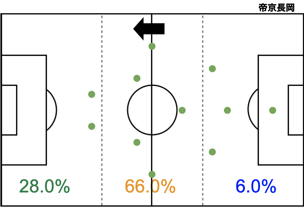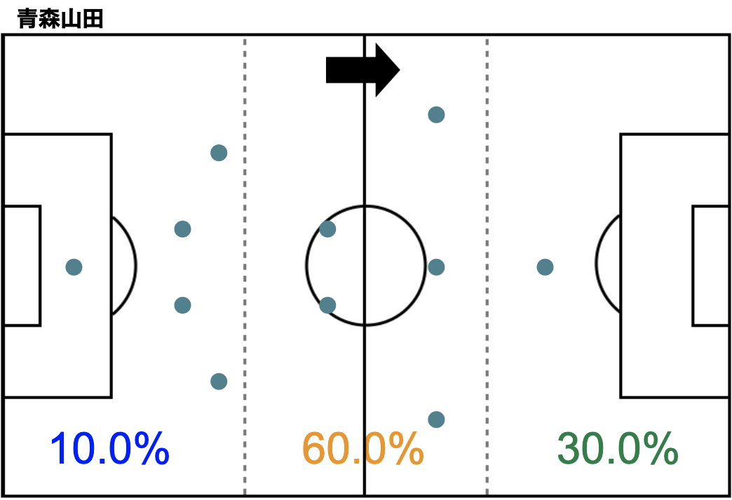青森山田はシンプルにプレーしていましたが、相手陣地1/3での30.0%と比較的高い位置でプレーしていたことがわかります。